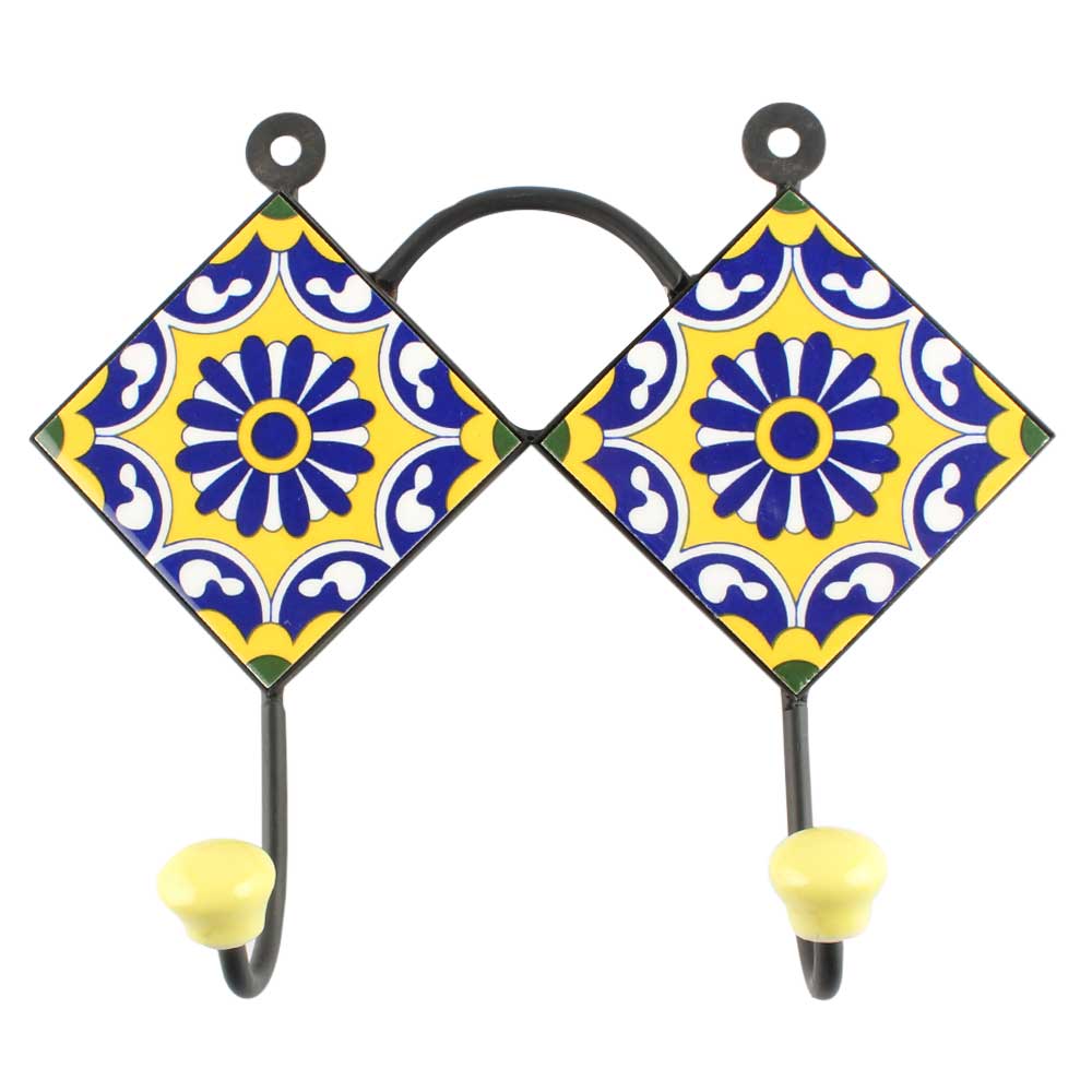 Navy Blue Wheel Flower Ceramic Tiles Hook Online. When Put on Wall or Cabinet It is An Art in Itself. The Metal Part of this Hook is Black Powder Coated.
