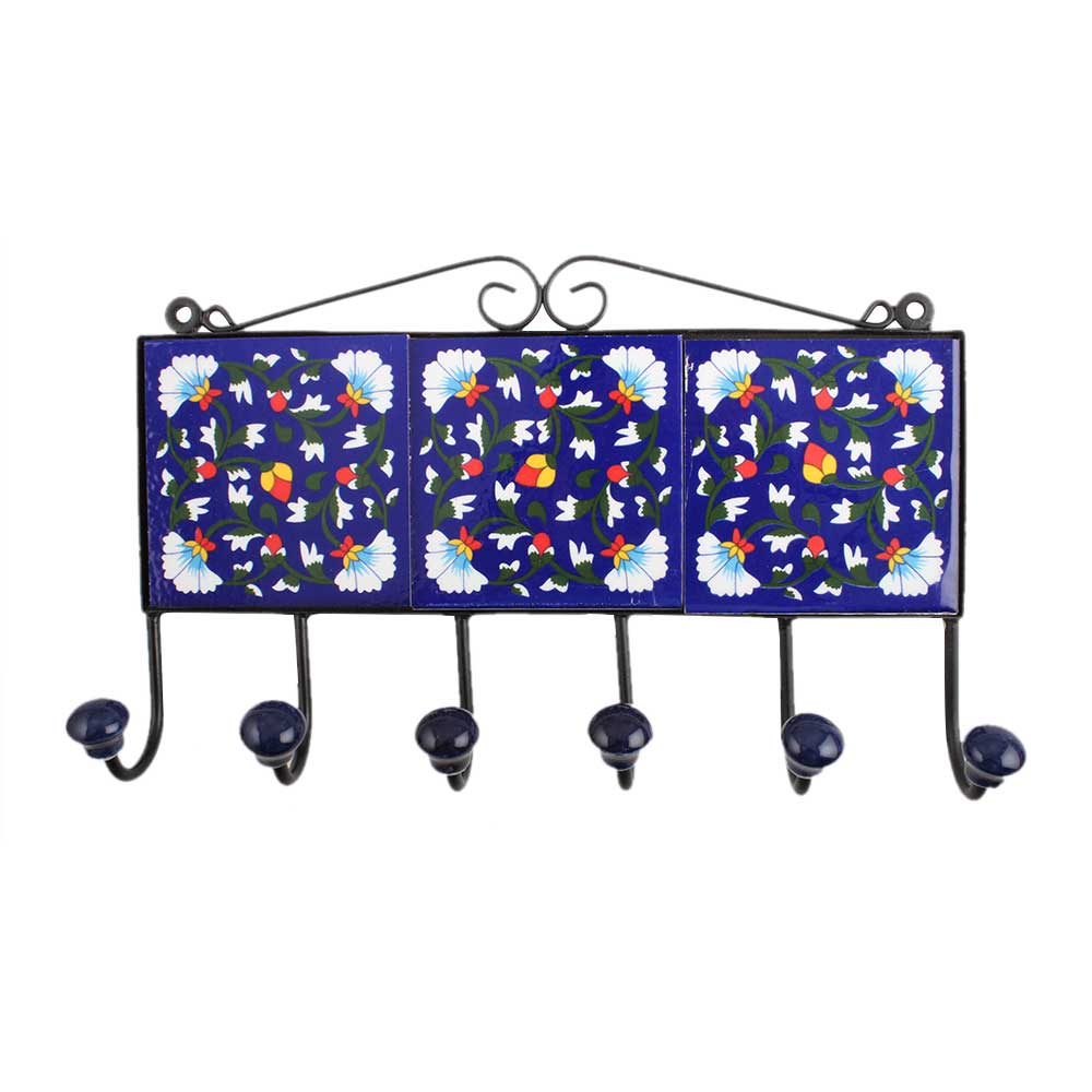 Navy Blue White Floral Tiles Hook. When Put on Wall or Cabinet It is An Art in Itself. the Metal Part of This Hook is Black Powder Coated.