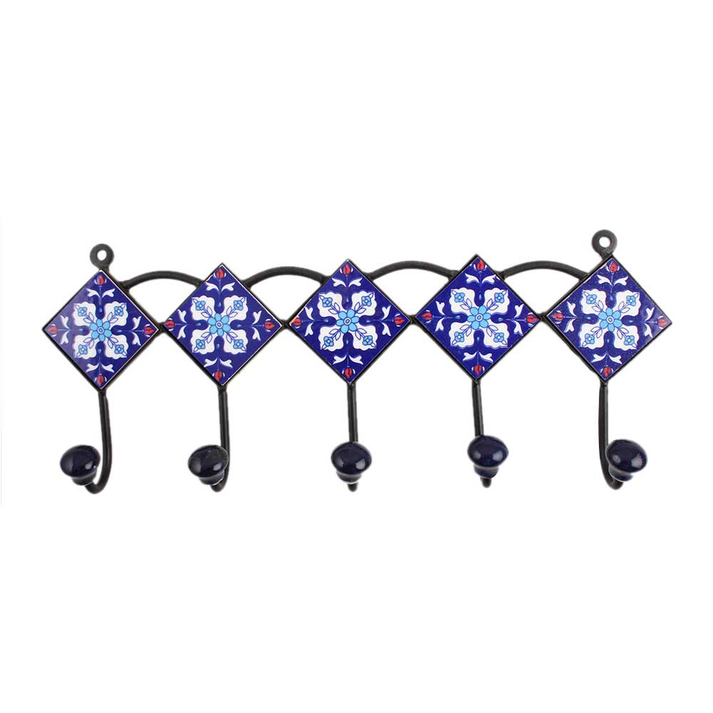 Navy Blue White Floral Tiles Hook. When Put on Wall or Cabinet It is An Art in Itself. the Metal Part of This Hook is Black Powder Coated.