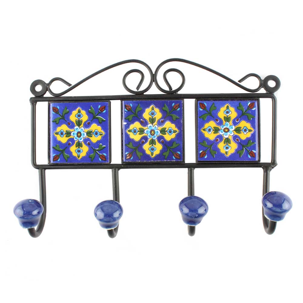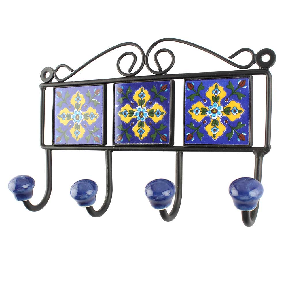 Navy Blue With Yellow Leaf Ceramic Floral Tiles Hook. When Put on Wall or Cabinet It is An Art in Itself. The Metal Part of this Hook is Black Powder Coated.