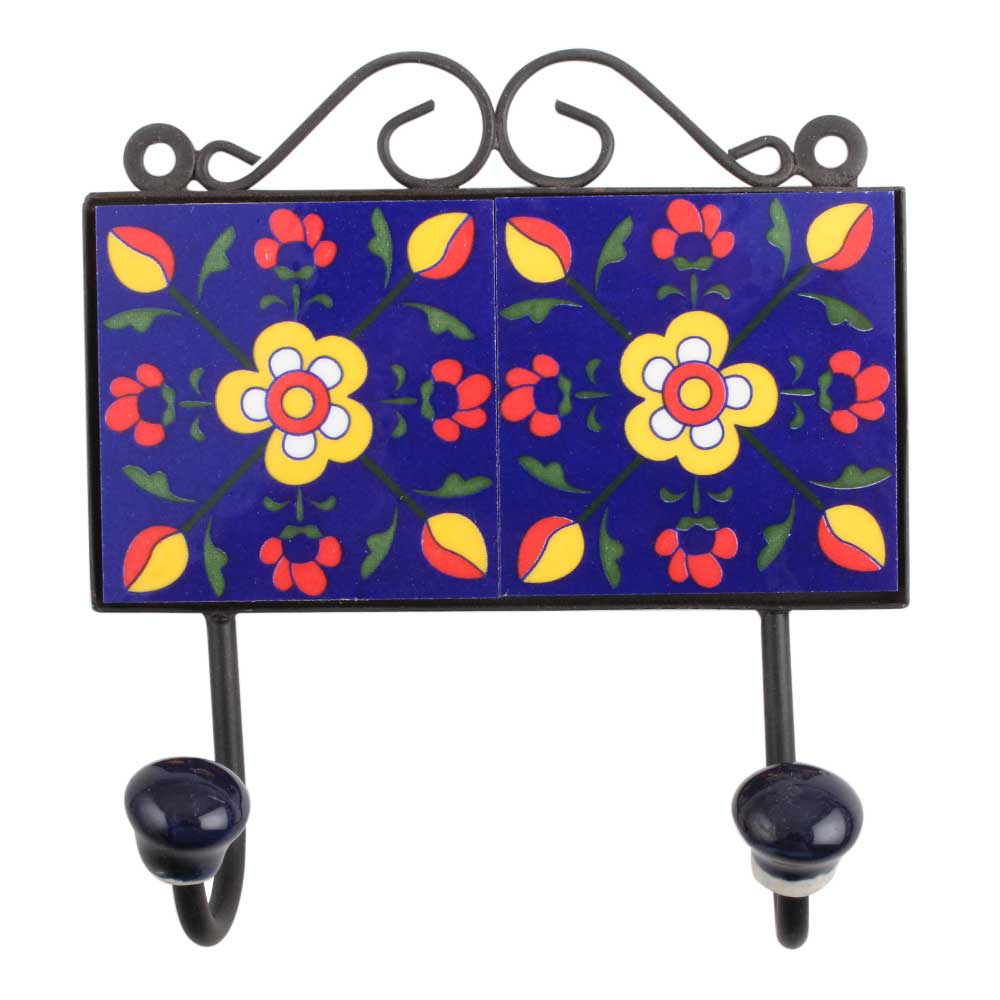 Navy Blue Yellow Floral Tiles Hook.When put on wall or cabinet it is an art in itself. The metal part of this hook is black powder coated.