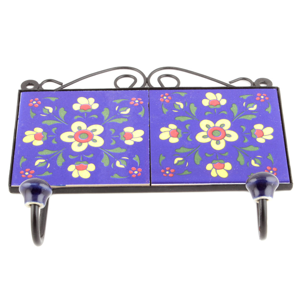 Navy Blue Yellow Floral Tiles Hooks.When Put on Wall or Cabinet it is an Art in itself. The Metal Part of this Hook is Black Powder Coated.