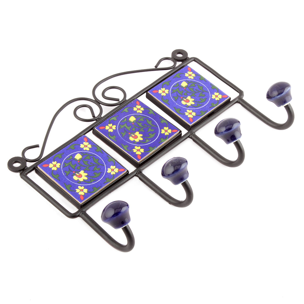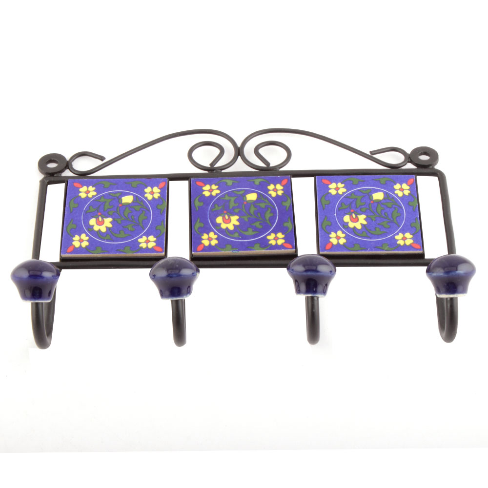 Navy Blue Yellow Floral Tiles Hooks. When Put on Wall or Cabinet it is an Art in itself. The Metal Part of this Hook is Black Powder Coated.