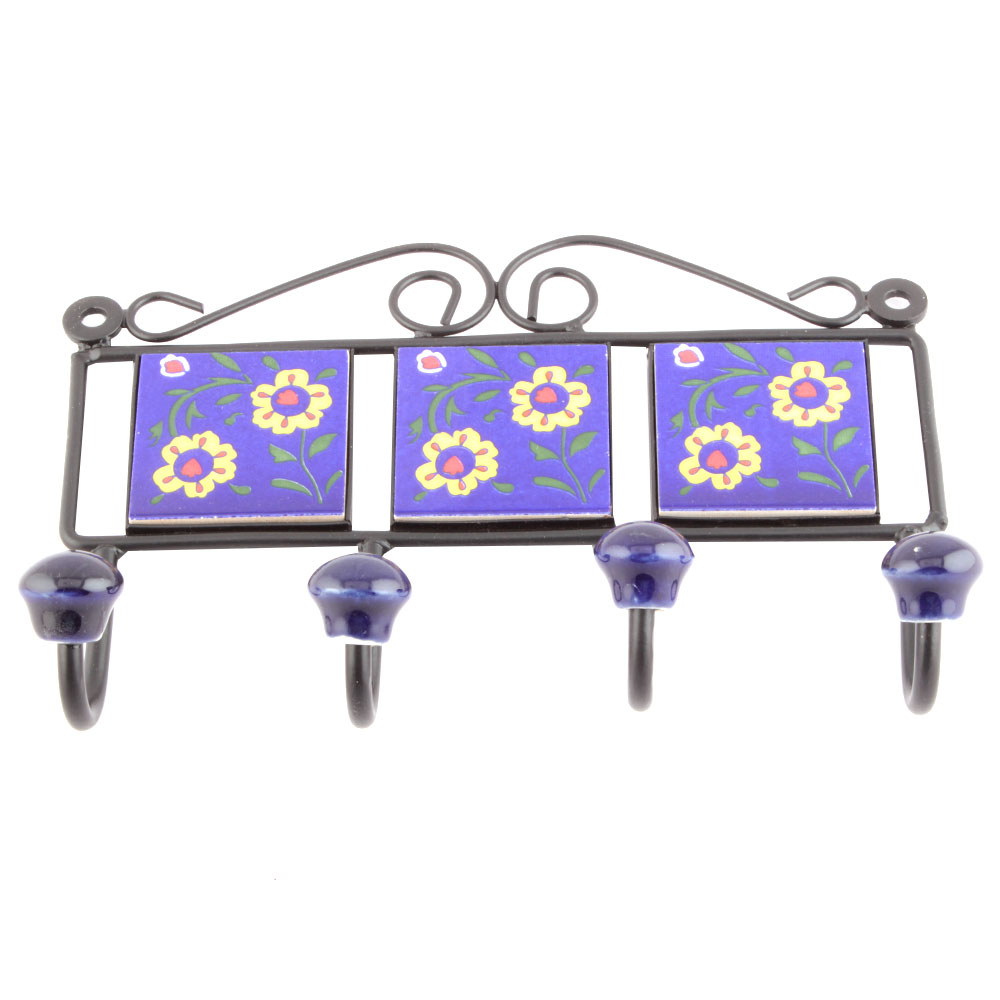 Navy Blue Yellow Flower Tiles Hooks. When Put on Wall or Cabinet it is an Art in itself. The Metal Part of this Hook is Black Powder Coated.