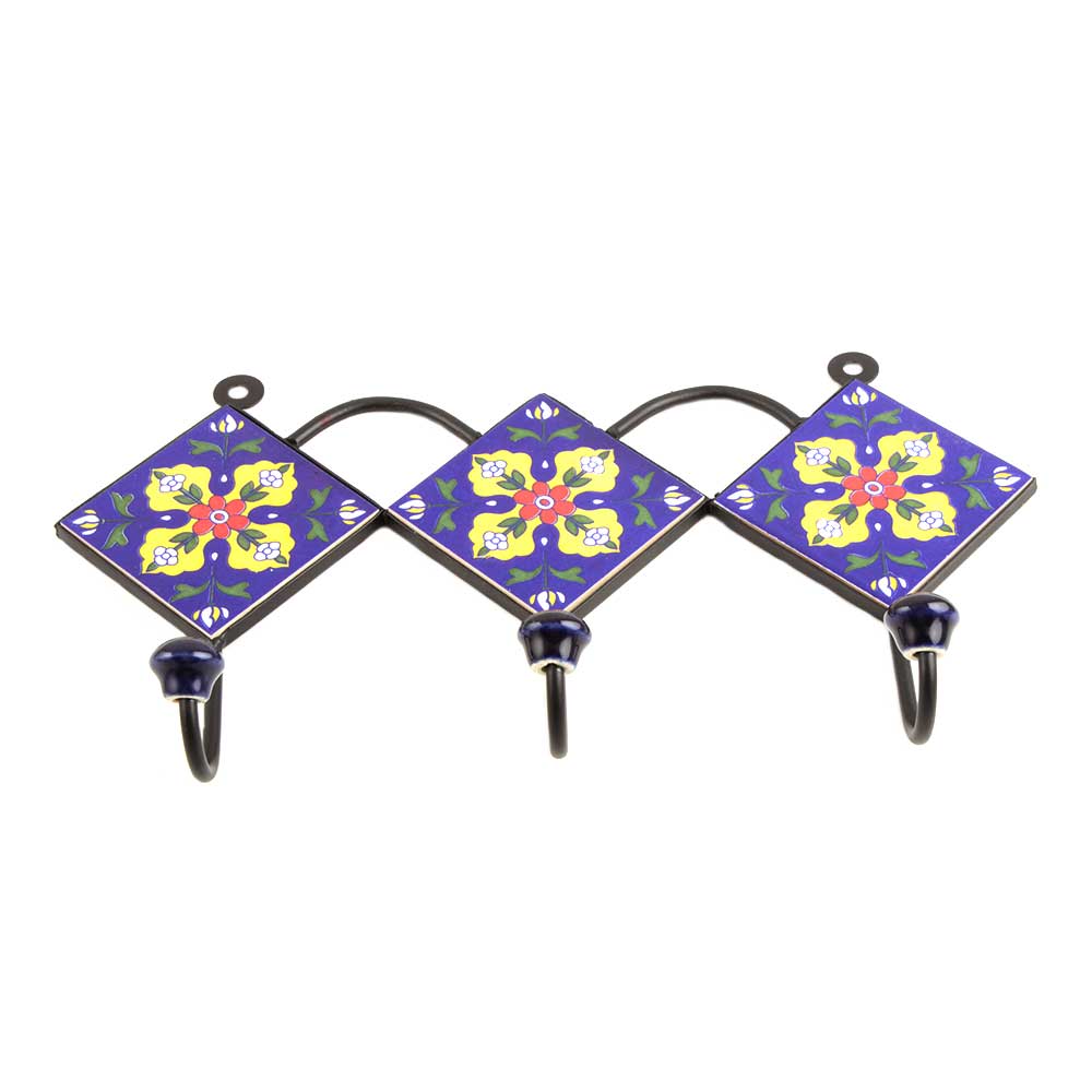 Navy Blue Yellow Leaf Tiles Hook. When Put on Wall or Cabinet It is An Art in Itself. the Metal Part of This Hook is Black Powder Coated.