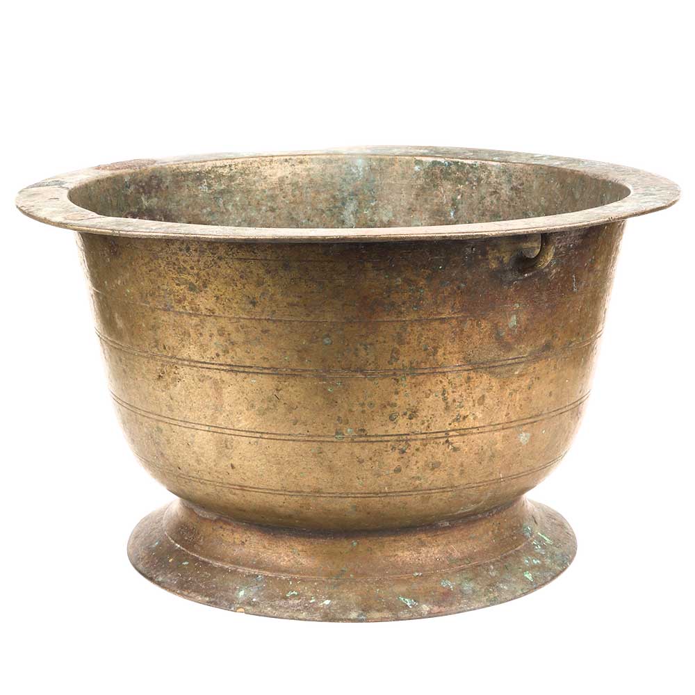 Old brass flower pot with one single ring handle for hanging plants and planters for your porch, patio and balcony. Use t as a planter pot, flower decoration, as incense burner, table decoration or food decoration.