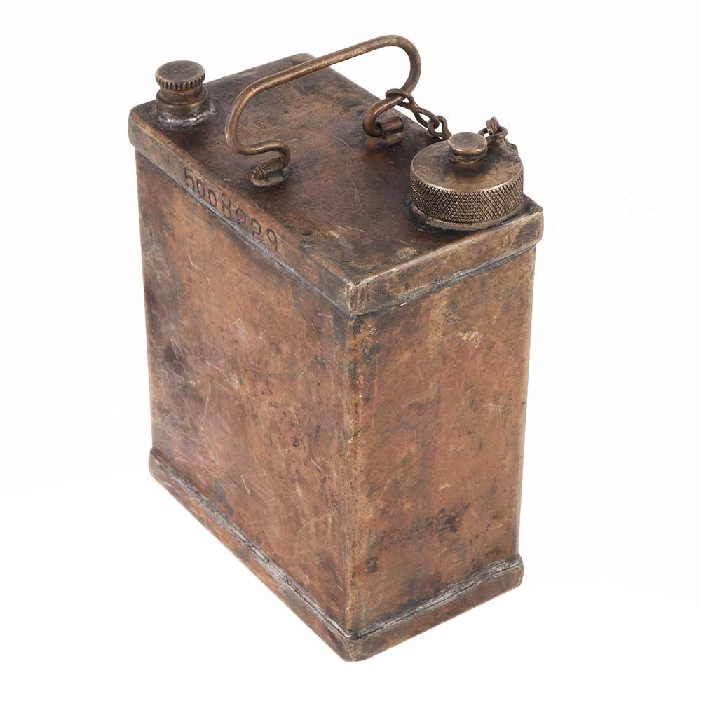 Primitive Petrol tin can with brass cap that has been drained and cleaned and is actually extremely ancient with thick patina that shows wear and tear. A true collector's item that is ideal for both collection and gifting.
