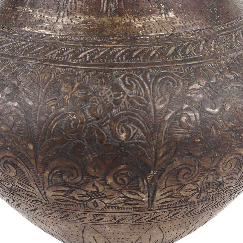 This brass pot is also known as kalash pot with lovely engraved pattern of leaves and flowers in the centre as well as the border . Use it place of worship. Temples in pooja room to store holy water or use it as kalash. Gift it to near and dear ones on diwali, new year or other auspicious functions and festivals. It comes with patina.
