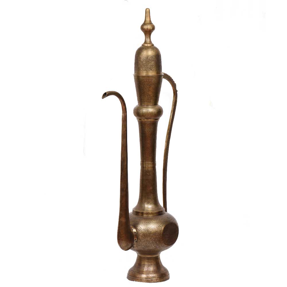 Old large brass ewer aftaba or pitcher with engraved floral design and movable lid, brass surahi, Indian flower pot, Persian décor. This classic ewer from India and Persia with significant Islamic characteristics has a very attractive slim and elegant shape that can become a focal point in your home decor.