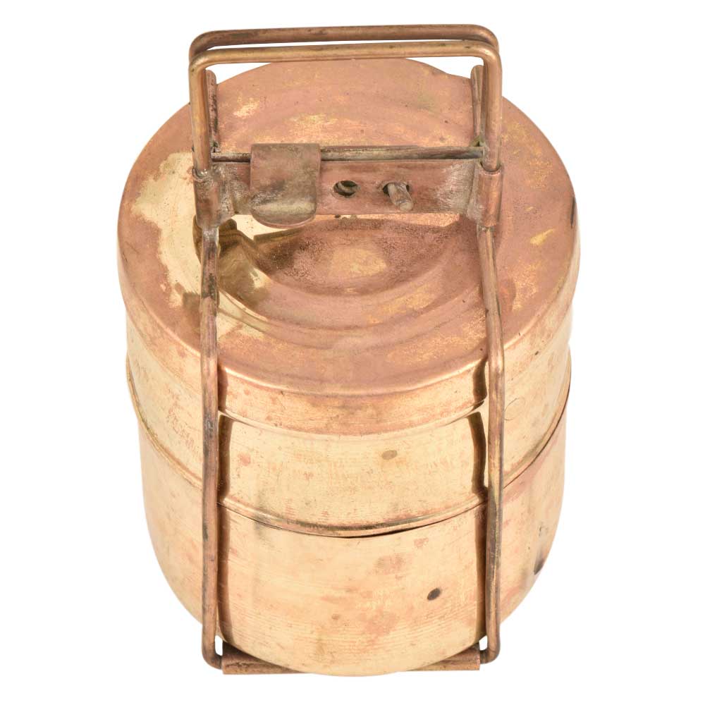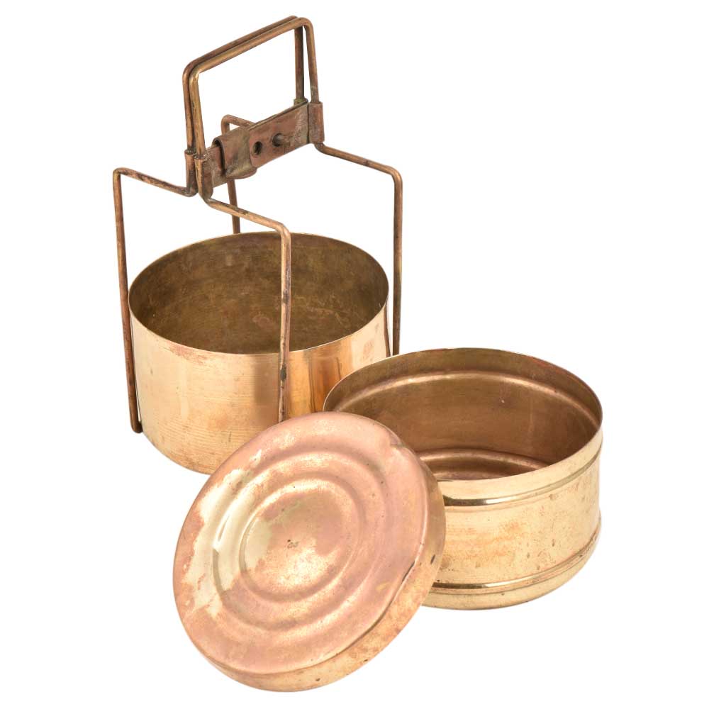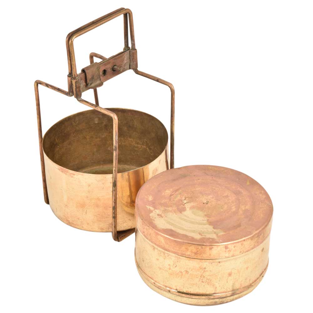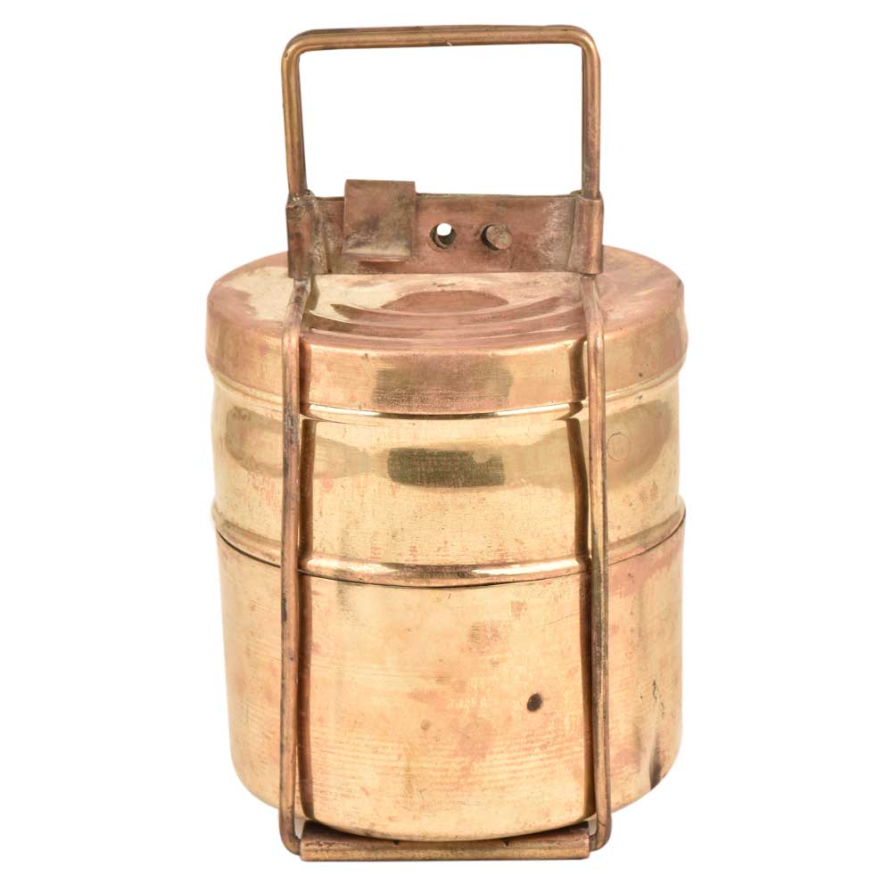 This is an old brass lunch box with two containers. The brass lunch boxes were very popular and are now used as table ornaments, jewelry storage or presentation of food .The boxes were are engraved with the names of the owner so that it could not be misplaced.