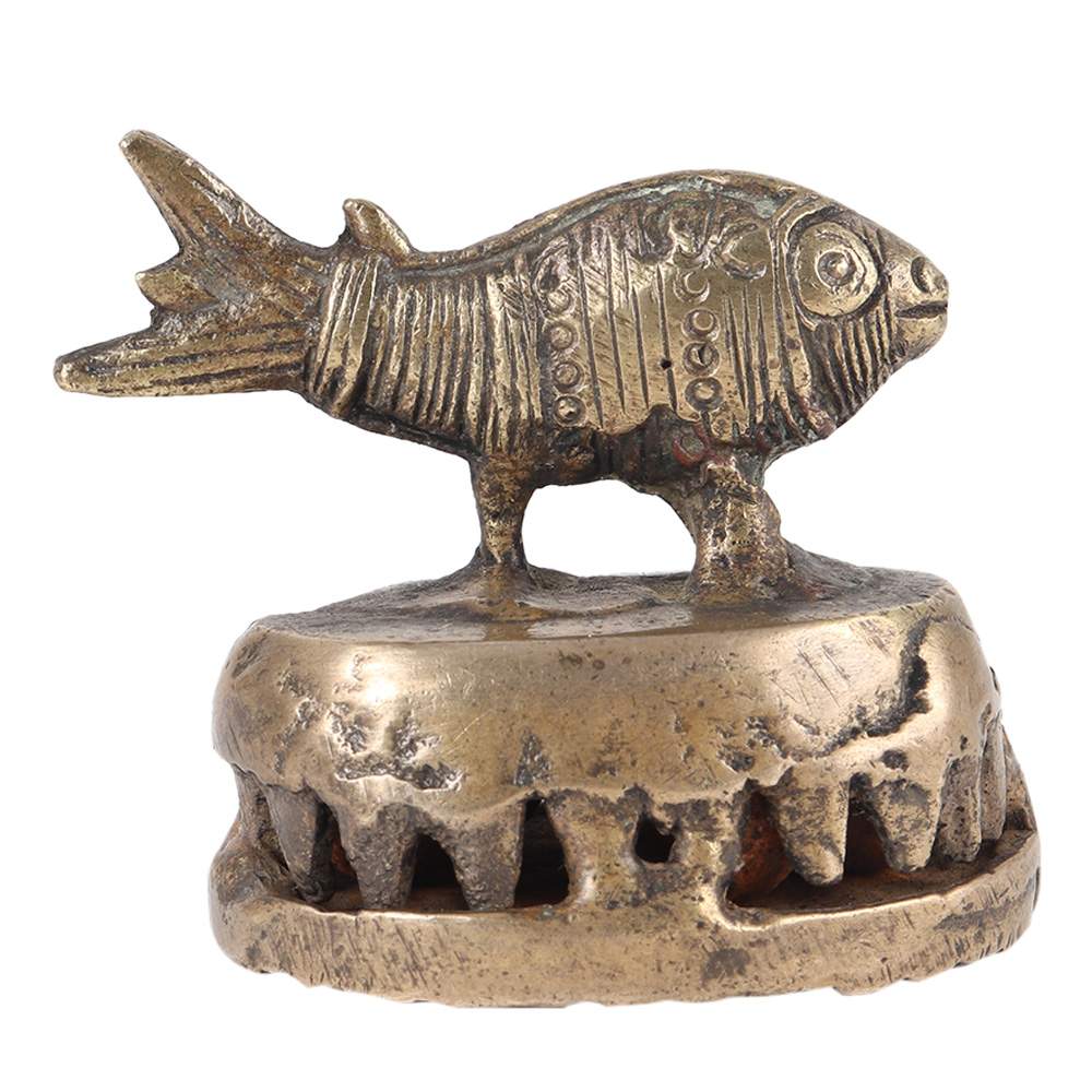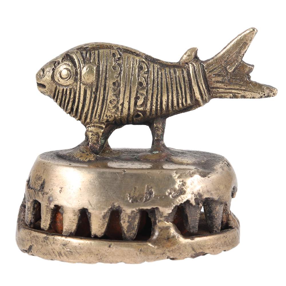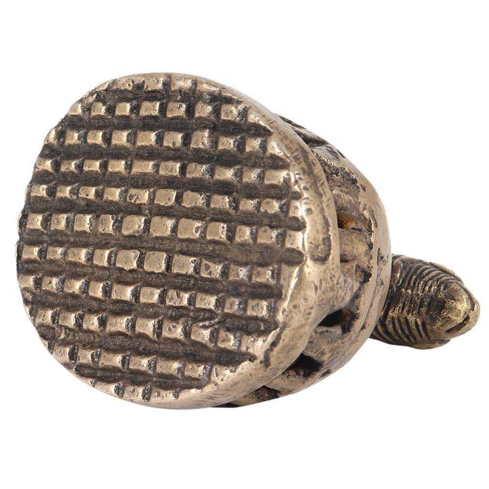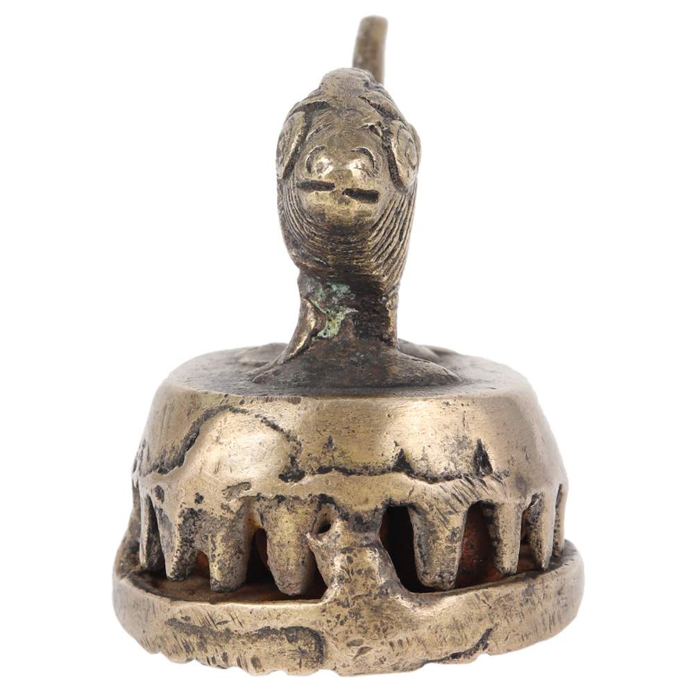 This is a Folk Brass (village) foot scraper or scrubber (vajri) from India. The functional part is surmounted by a depiction of an elephant. Foot scrapers, as the name would suggest, were used to smooth the skin on the soles of ones feet, and it was something done in private. Within the base are small, loose metal balls (or bells) which emit a distinctive ringing sound when the scraper was being used, tactfully warning people not to enter the room