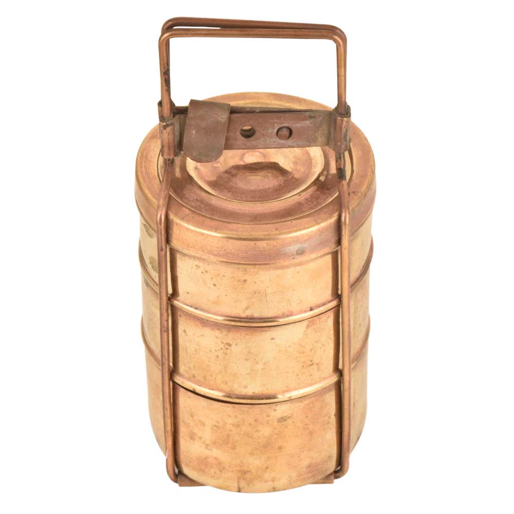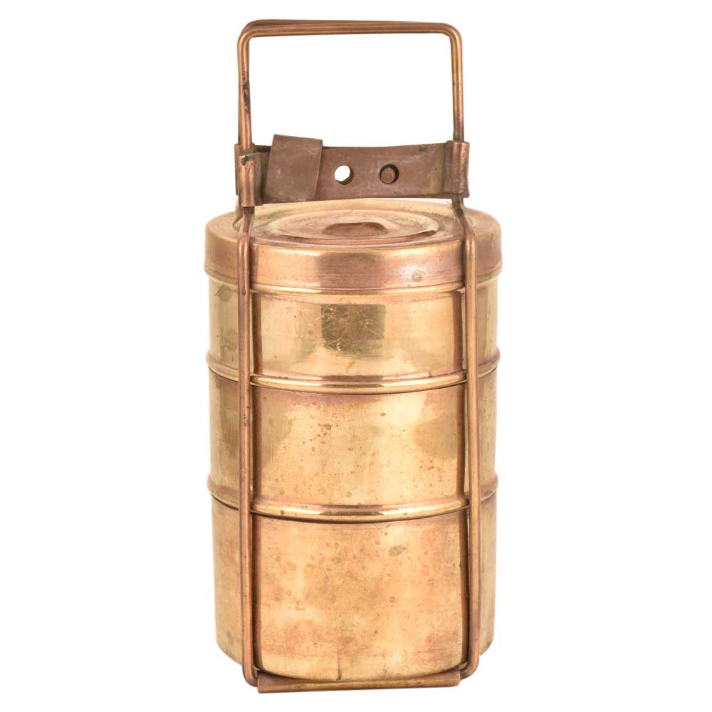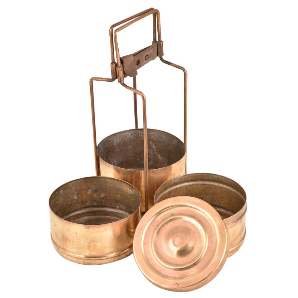This is an old brass lunch box with three containers. The brass lunch boxes were very popular and are now used as table ornaments, jewelry storage or presentation of food .The boxes were are engraved with the names of the owner so that it could not be misplaced.