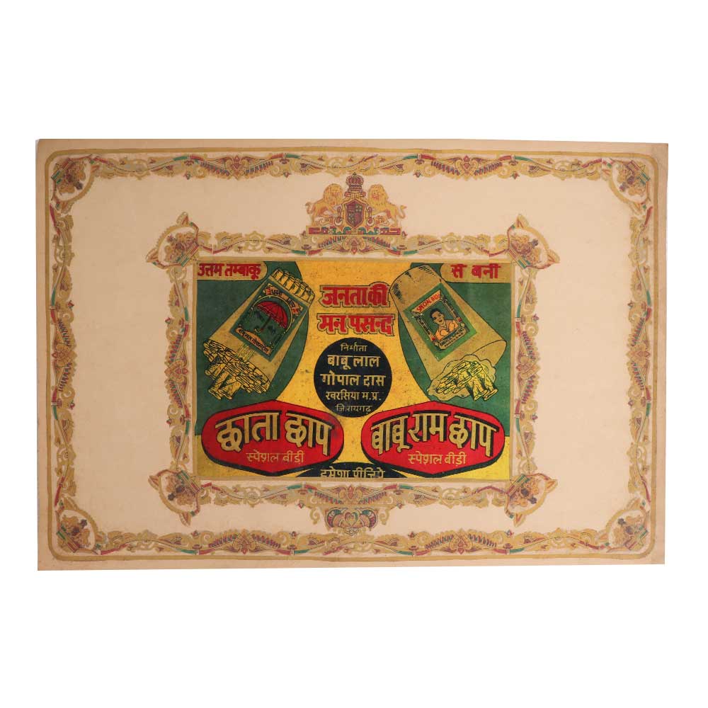 Step back in time with this vintage Bidi cigarette advertisement oleograph art print. A smiling mustached man enjoys a Bidi, an iconic Indian hand-rolled cigarette. The retro-style graphics playfully promote the cigarettes with bright colors and vintage typography. This oleograph print lets you liven up your walls with a cool nostalgic style. It's ideal for someone who wants to showcase vintage Indian advertisements and branding. The art print is full of character with its cheeky smiling man and funky retro design. Made using a traditional oleograph printing process on durable paper, the colors stay bold and vivid for many years. For someone who remembers when Bidi cigarettes were all the rage, this print makes a thoughtful gift. Relive the golden days of Indian pop culture and advertising with this classic Bidi cigarette ad print!