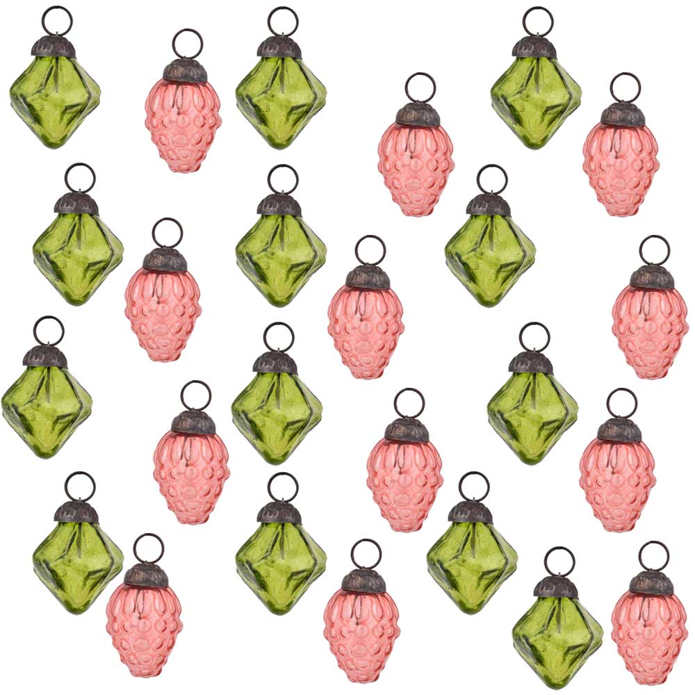 Olive Green Pink Combo Glass Tiny Christmas Hanging Set of 25