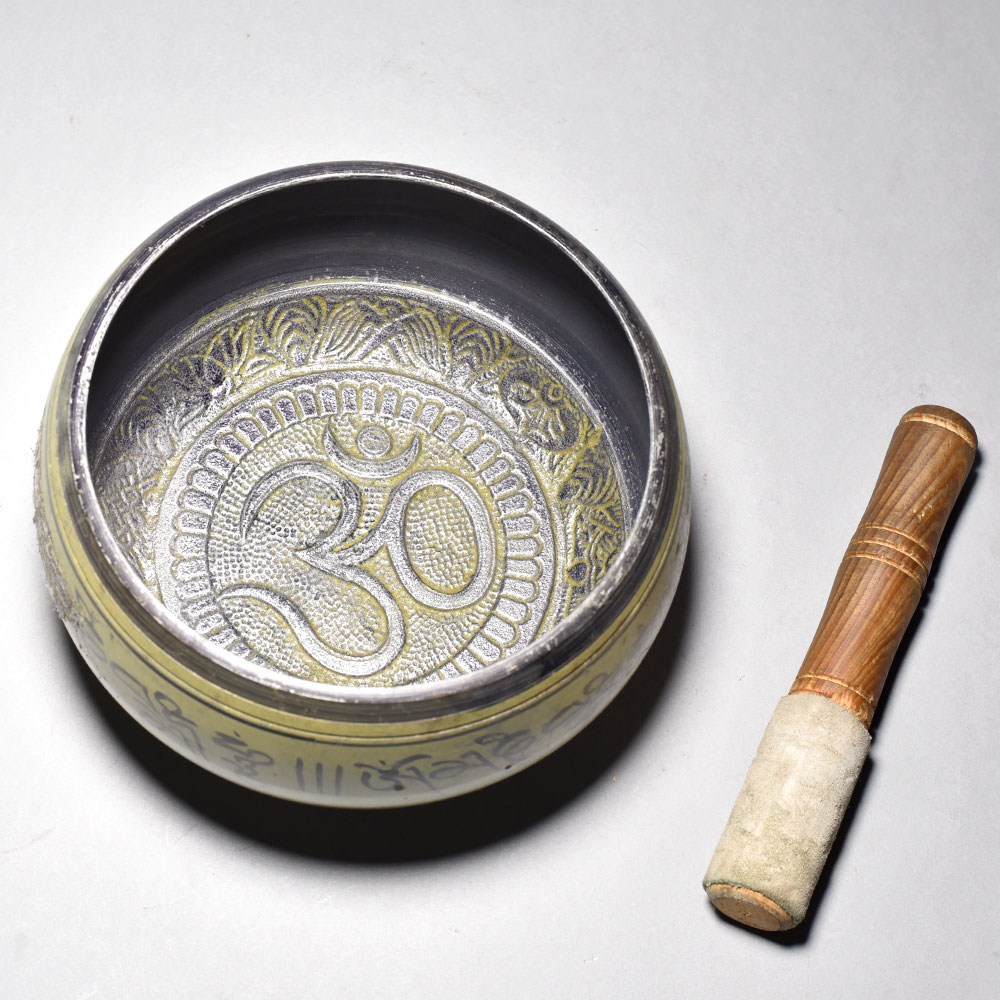 Unlock the secrets of Tibetan sound healing with this mesmerizing Om Carved Tibetan Singing Bowl.Immerse yourself in the ancient wisdom of Tibetan sound therapy with this captivating singing bowl. The soothing, resonant tones it produces have been used for centuries to quiet the mind, relieve stress, and restore balance to body and spirit. Infused with sacred Tibetan symbols and mantras, this exquisite bowl serves as a gateway to deeper states of consciousness and inner peace. Whether you're an experienced meditation practitioner or simply seeking a calming presence in your home, this Tibetan singing bowl will elevate your journey to tranquility. This stunning singing bowl makes the perfect addition to any meditation space, yoga studio, or home. Its elegant, hand-carved design and rich, resonant tone will transport you to the serene landscapes of the Himalayas, allowing you to tap into the ancient wisdom of Tibetan sound healing. Handcrafted from premium metal with intricate Tibetan carvings Produces a captivating, resonant tone that promotes relaxation and meditation Infused with traditional Tibetan mantras for added spiritual energy Beautifully hand-painted with vibrant Tibetan-inspired designs