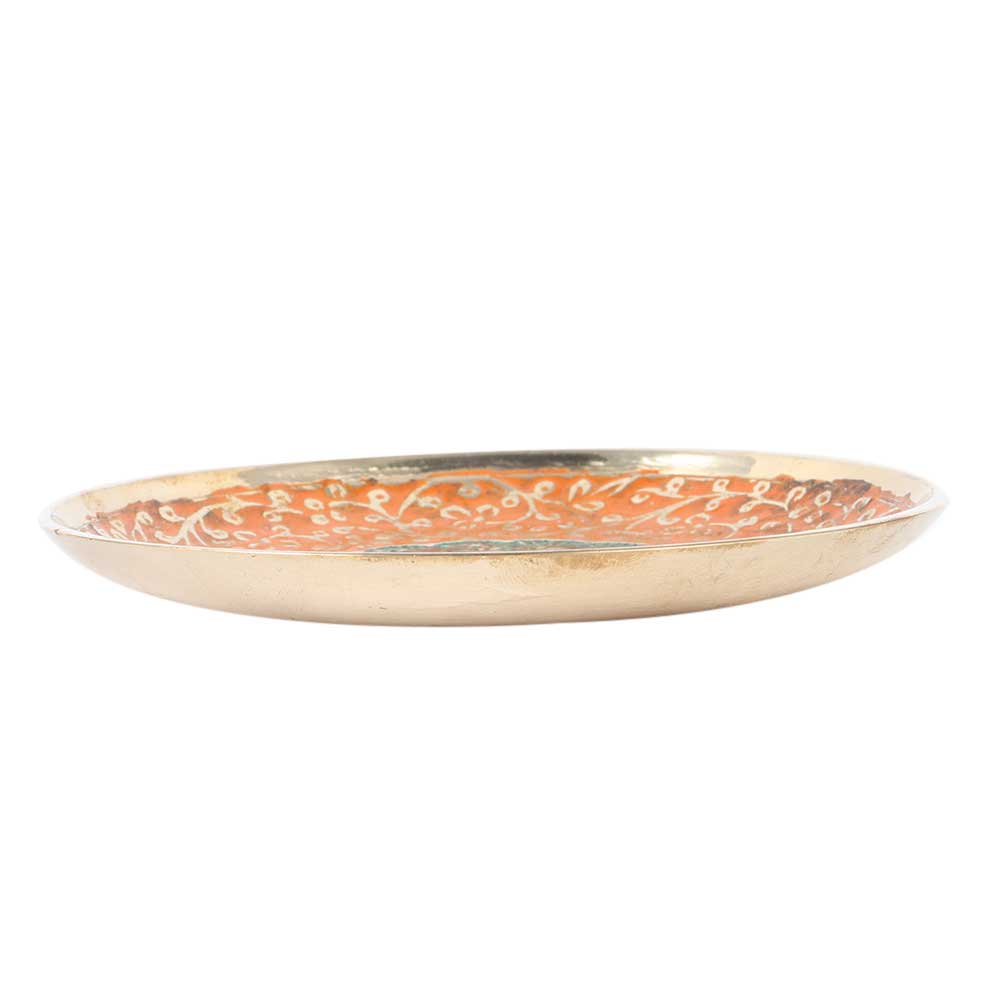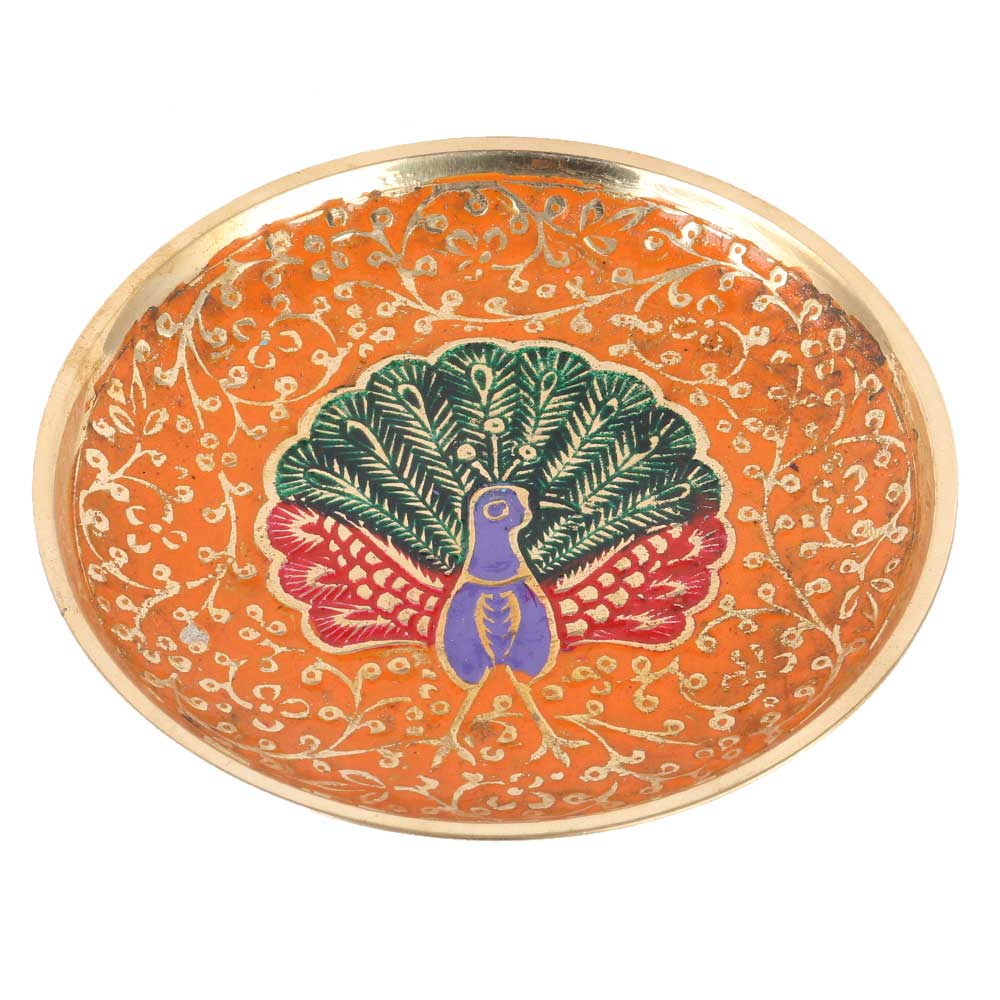 This lovely brass coaster with Meenakari work will steal your heart at first sight. Bring home this exquisitely created Brass Meenakari Peacock design tea or coffee coaster in orange color which will add opulence to your religious rituals and holidays.