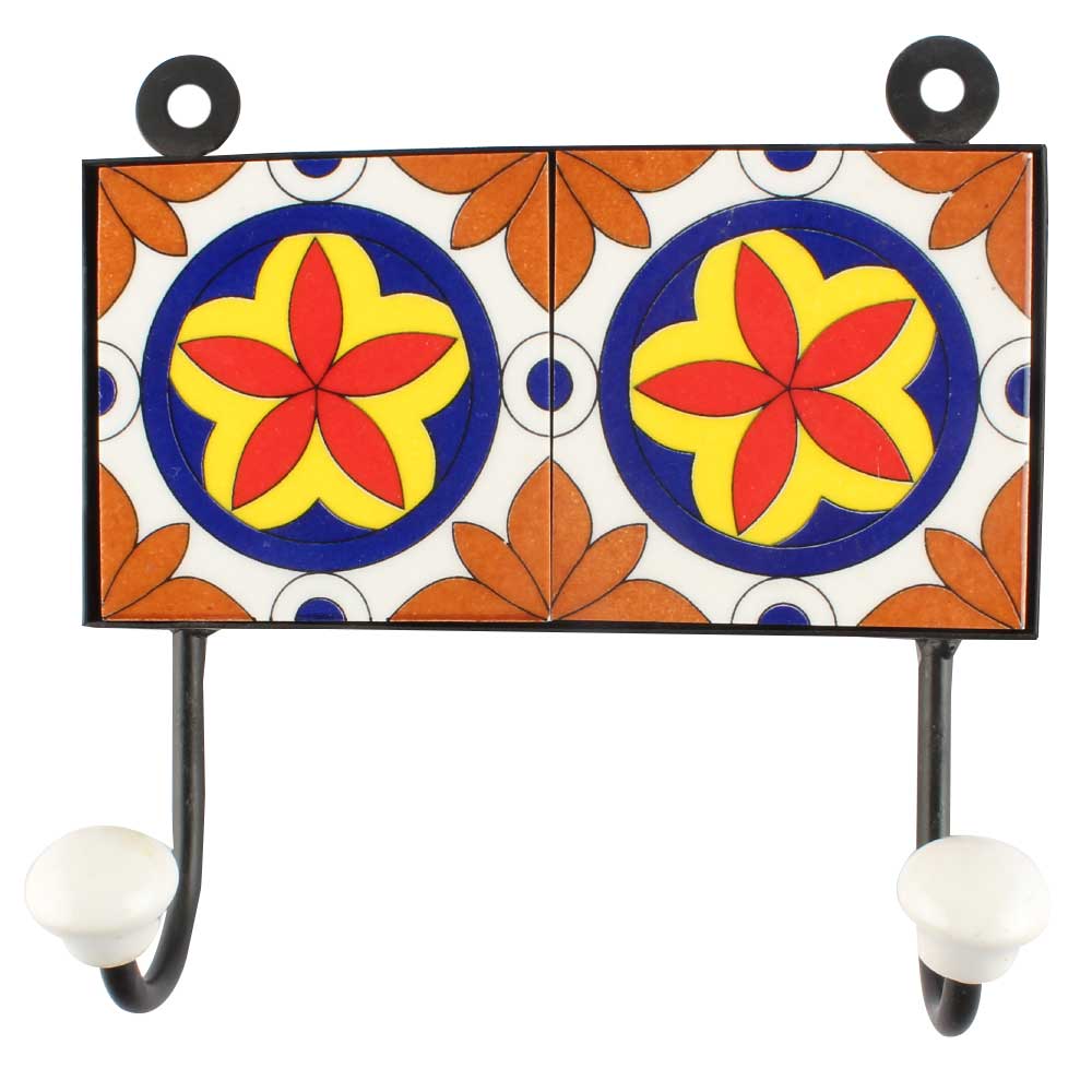 Orange Flowerl Ceramic Tile Hook. When Put on Wall or Cabinet It is An Art in Itself. The Metal Part of this Hook is Black Powder Coated.