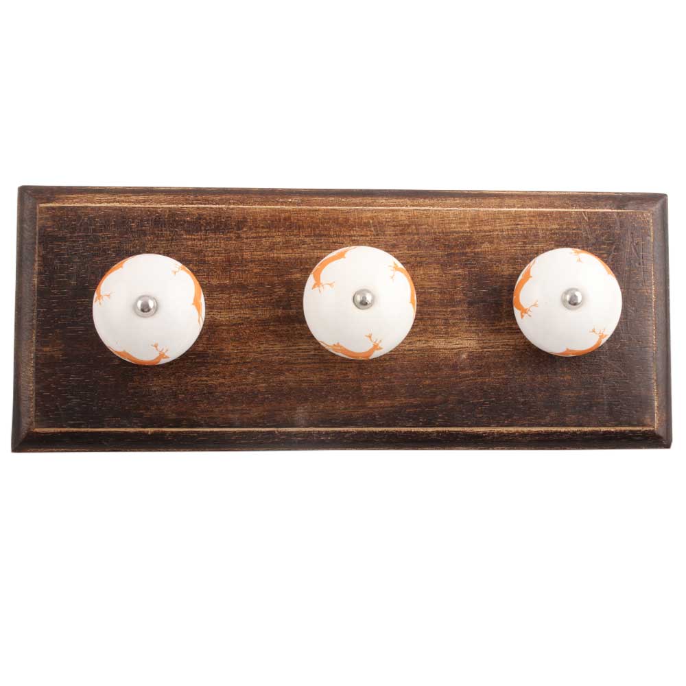 Orange Running Rein Deer Pattern Ceramic Wooden Hook. A Perfect Complement to the Soft Tone of the Wood are these White Traditional Hat & Coat Hook Made of Genuine Porcelain and Brass. It can be use to Hang Jewellery, Leashes, Towels, Scarves, Light Weight Sweaters, Caps Etc.