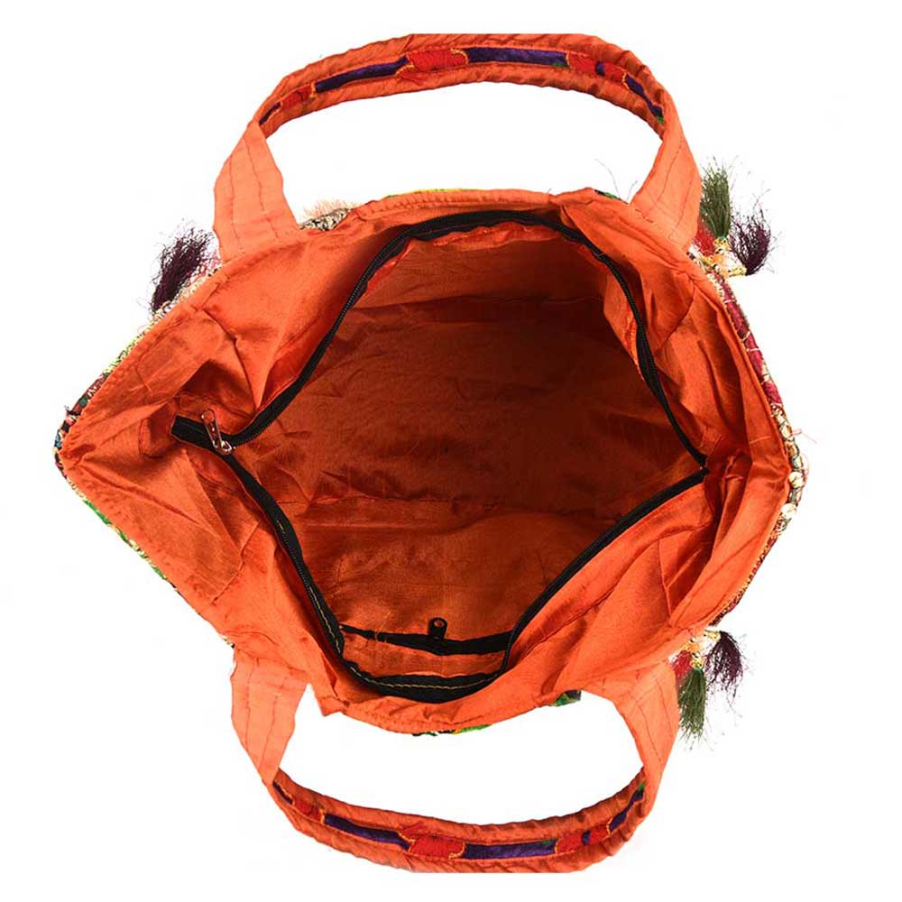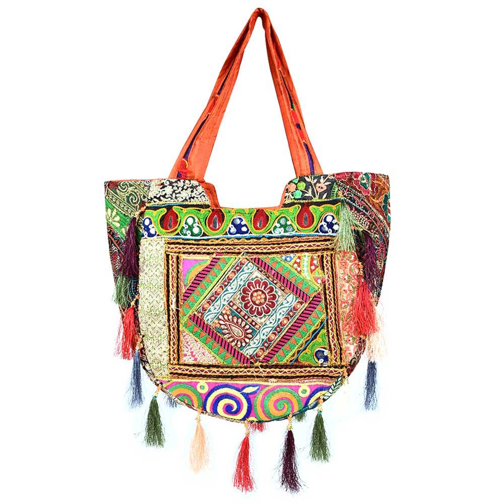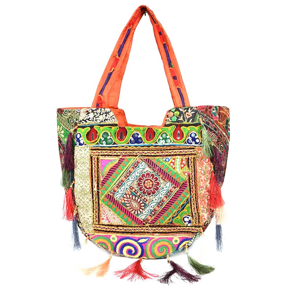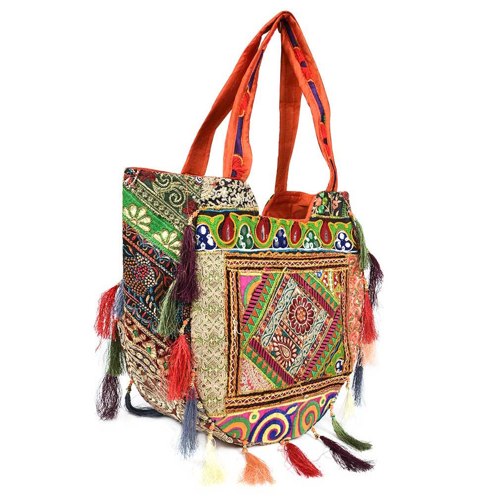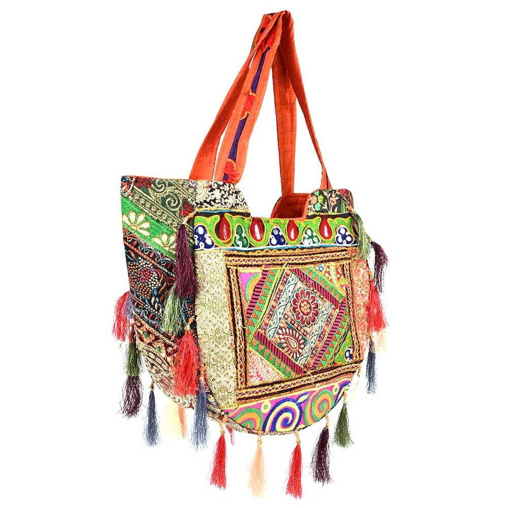 Orange patchwork Sling tribal kutchi banjara bag boho Indian gypsy hand embroidered mirror work multi color bag with tassels vintage coins beads .