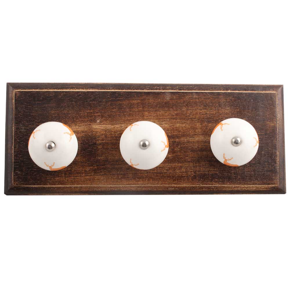Orange Standing Rein Deer Pattern Ceramic Wooden Hook. A Perfect Complement to the Soft Tone of the Wood are these White Traditional Hat & Coat Hook Made of Genuine Porcelain and Brass. It can be use to Hang Jewellery, Leashes, Towels, Scarves, Light Weight Sweaters, Caps Etc.