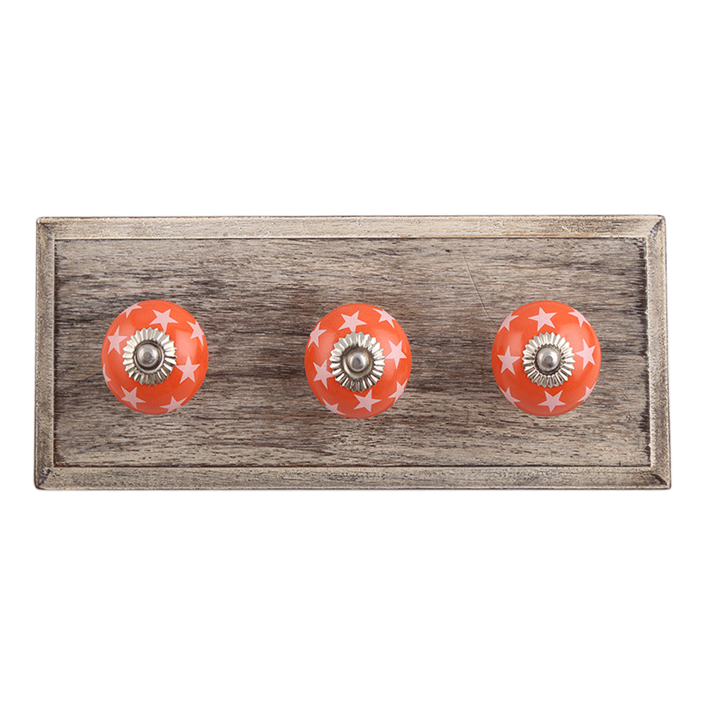 Orange Star Ceramic Wooden Hook. A Perfect Complement to the Soft Tone of the Wood are these White Traditional Hat & Coat Hook Made of Genuine Porcelain and Brass. It can be use to Hang Jewellery, Leashes, Towels, Scarves, Light Weight Sweaters, Caps Etc.