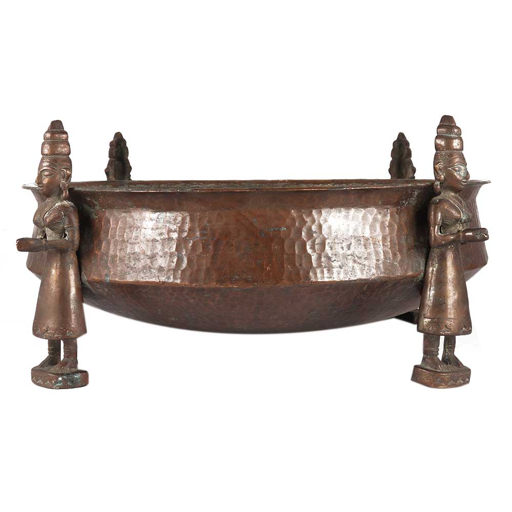Your guests will be surprised in this way when they see this brass bath basin for god bath with hammered design and medieval finish. The copper bowl is adorned with male figurines along the border, giving it an elegant appearance. On the outside, it has an exquisitely hand beaten design. When gifted, this great masterpiece would be a promising perquisite. Excellent gift for Deepavali, Karthigai dheepam, upanayanam, and weddings.