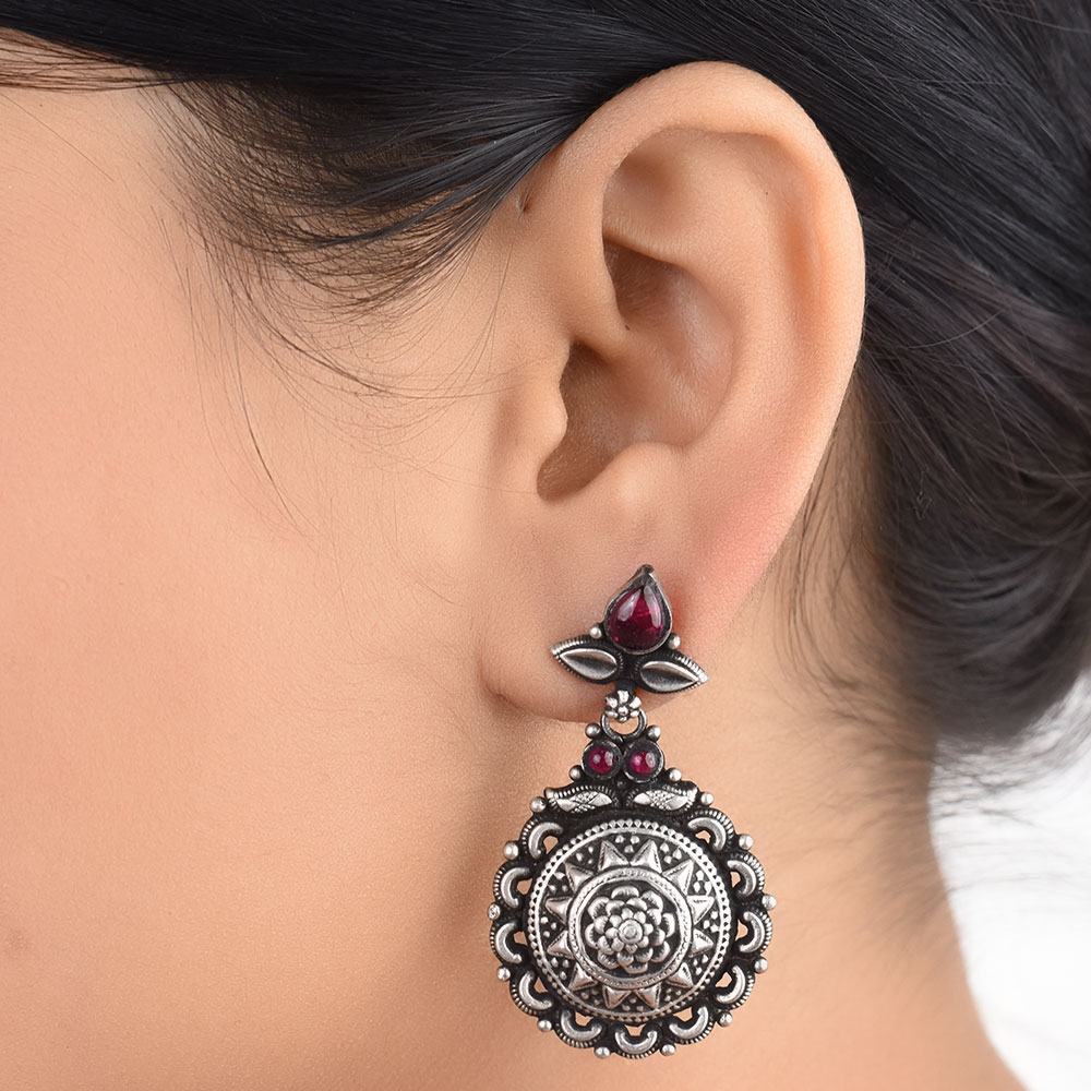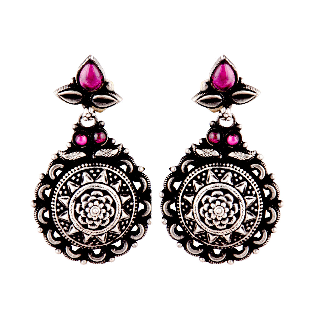 Oxidized 92.5 Sterling Silver earrings in a starry floral pattern inn a round shape with small motifs and pink Jade stones to give a burst of pink color to the jewelry. Wear it yourself or gift it to your friends and relatives.