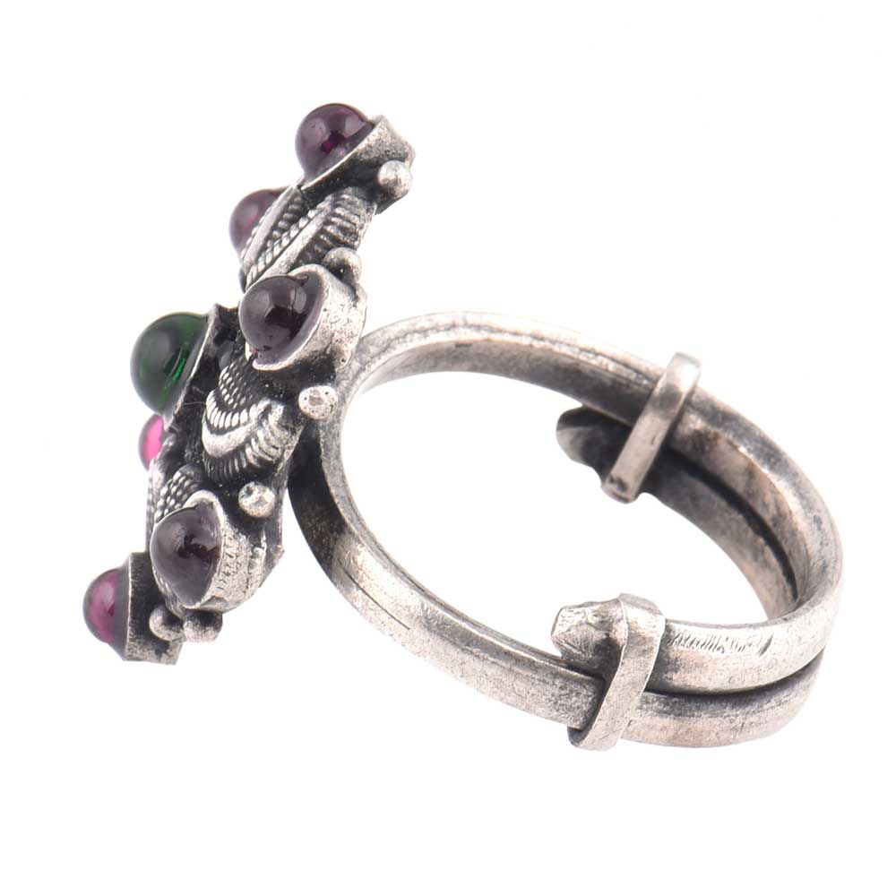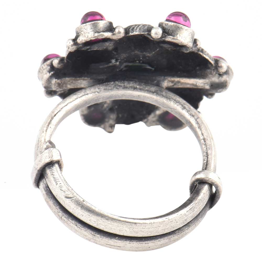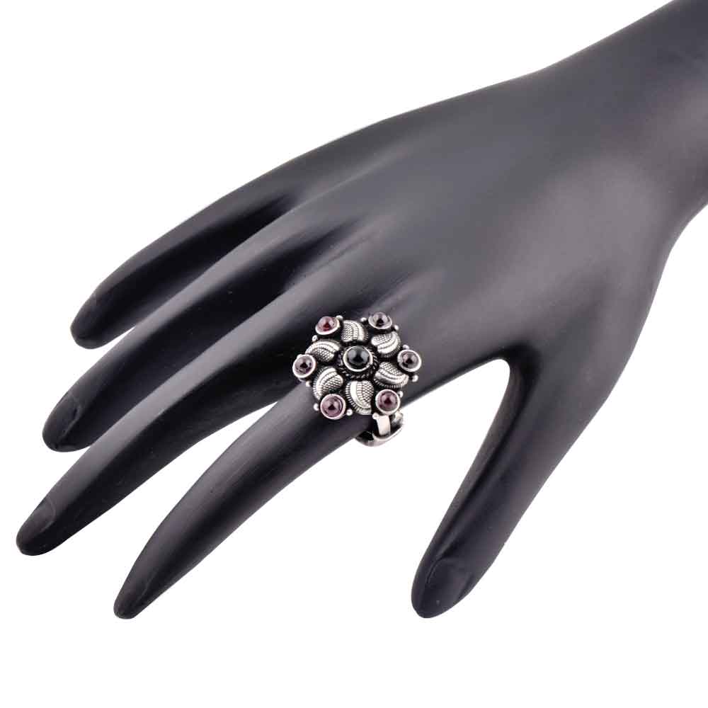 Oxidized 92.Sterling Silver ring specially suited for the royal Indian wedding , cocktail, anniversaries, get together, picnic, trip , shopping etc. Excellent gift for your sister, wife, friend and mother. The design shows a beautiful flower decorated with amethyst and onyx semi precious stones made by expert craftsmen of India.