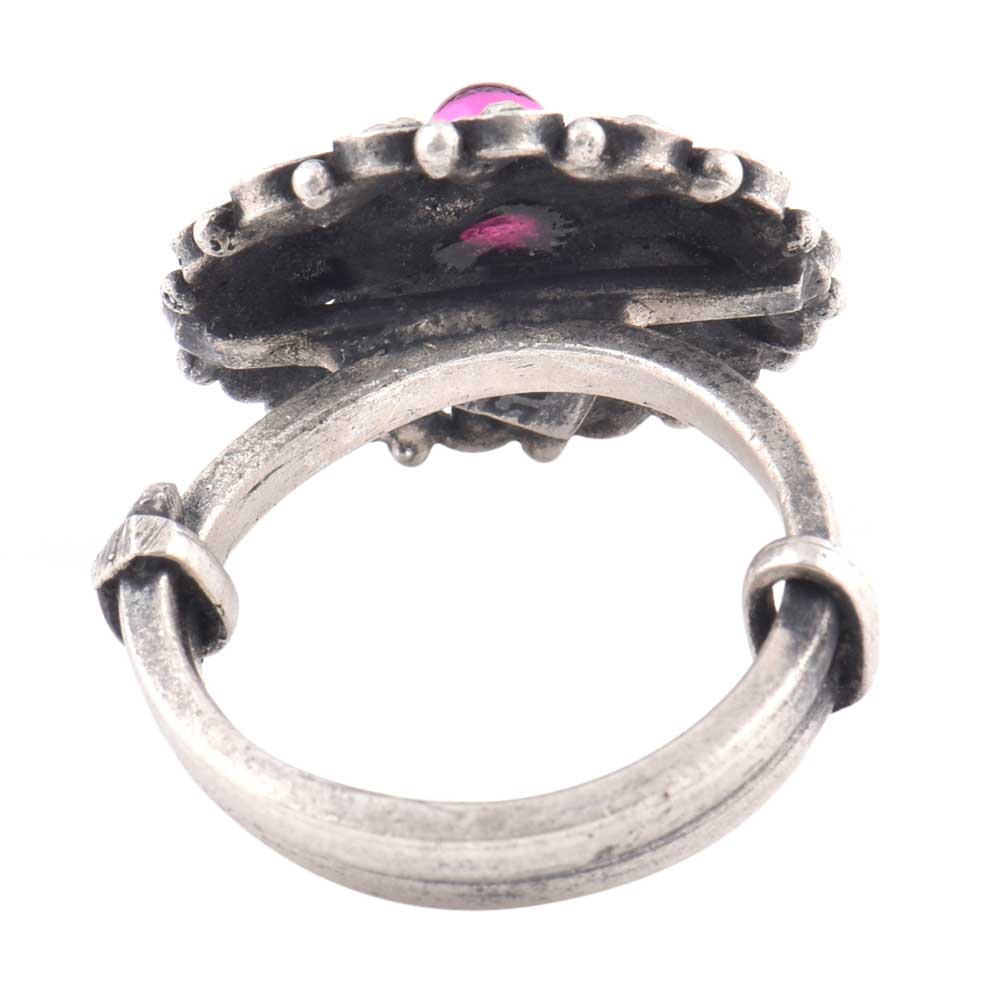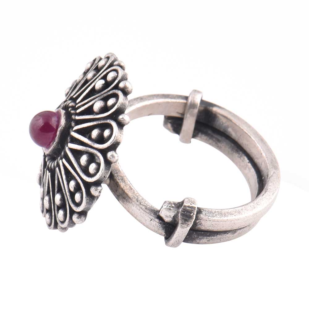 Make an impression by wearing this handcrafted Oxidized 92.5 Sterling silver ring that adjusts to the size of your finger. It is further decorated with semi precious Amethyst stone in the centre of floral design with two tiny balls on the edge of the petals. Wear it a wedding, engagement, birthday to complement it with your traditional as well as modern outfit.