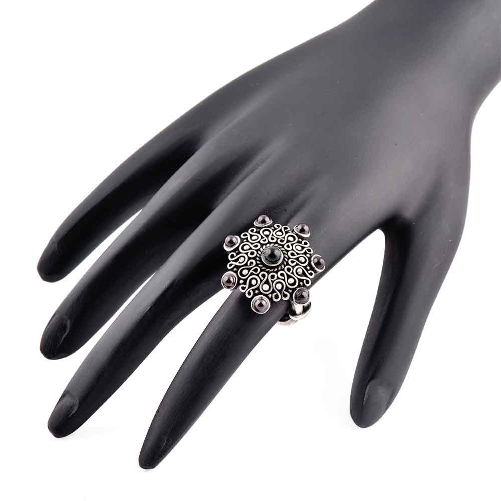 Modern adjustable oxidized 92.5Sterling silver ring studded with onyx and amethyst in the centre and on the edge of the petals of the floral design. Handcrafted to perfection this is the perfect accessory for sister, friend, mother and wife on weddings, Engagements, Bridal shower ,social functions, cocktails etc.