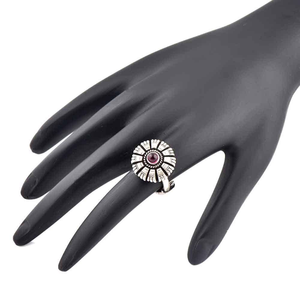 A very rare design of 92.5 sterling silver ring that can be adjusted according to the finger with a unique floral design with petals with a space in between and round Amethyst stone in the centre.
