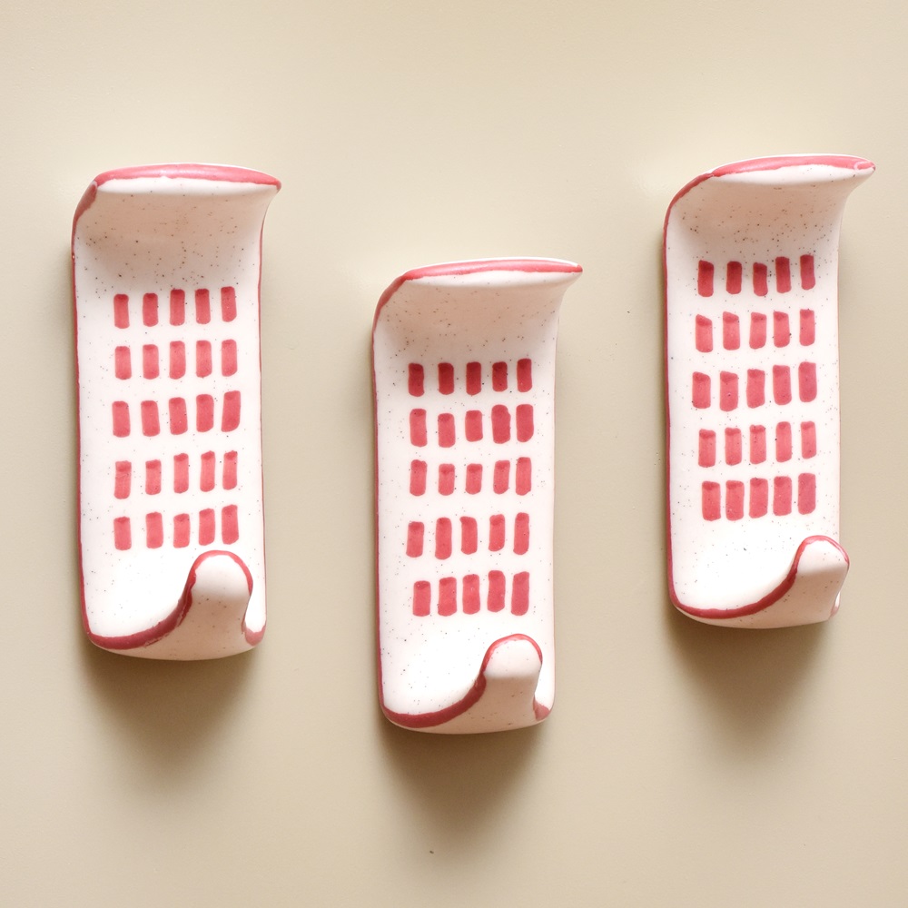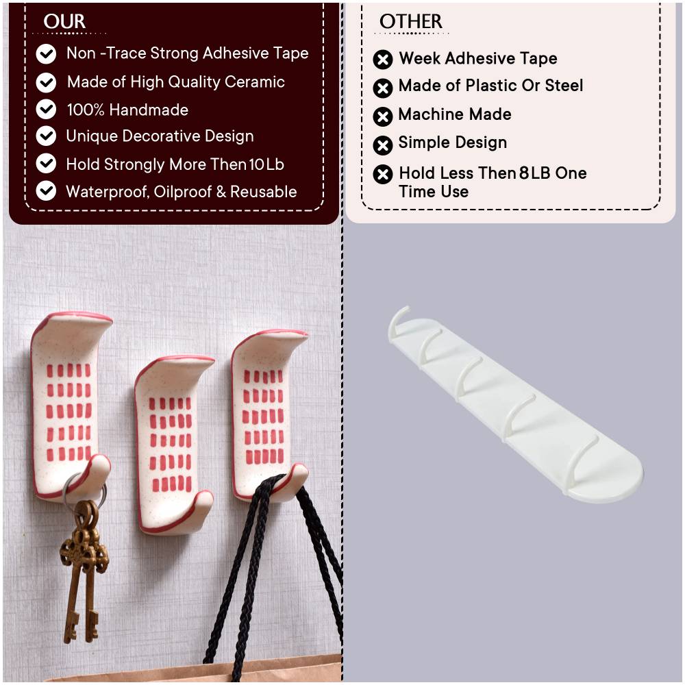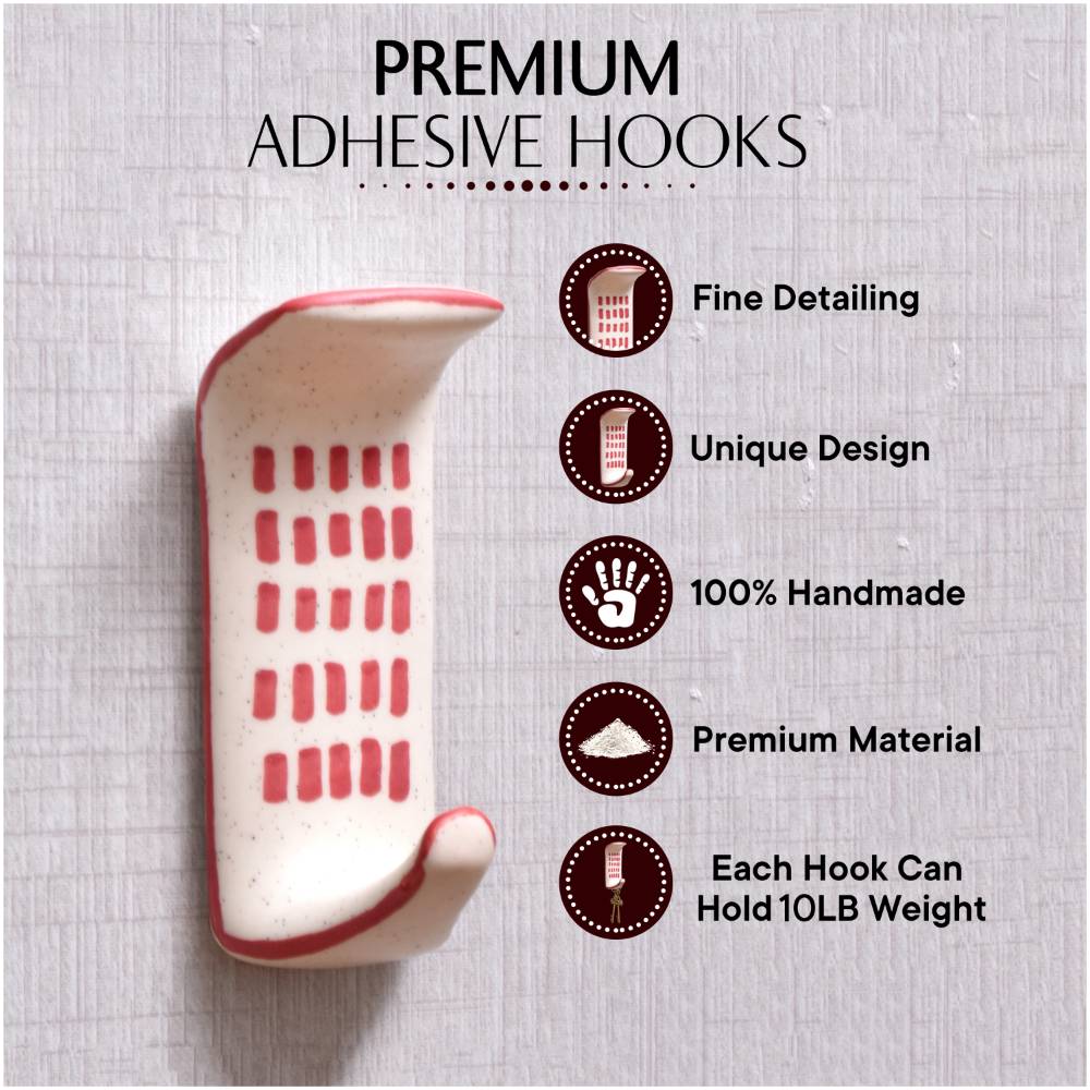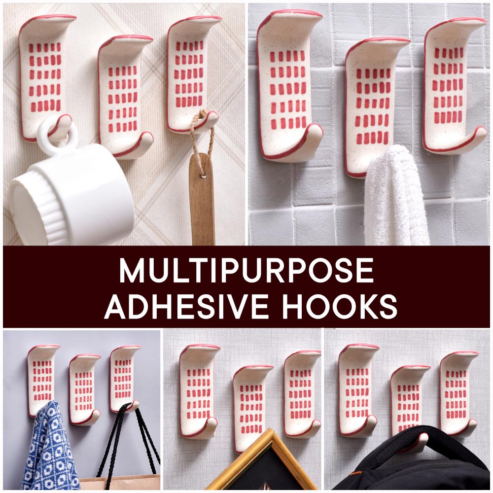 Tired of trying to find wall studs or make holes in your walls for traditional hooks? This ceramic adhesive hook makes hanging items a breeze with its innovative no-tools-needed stick-anywhere design. Stop struggling with permanent hardware and make your space more functional with these ceramic adhesive hooks. Their modern style and versatility allow you to instantly organize entryways, bedrooms, dorms, bathrooms, RVs, or any smooth surface. Just peel and stick to declutter while adding a stylish touch. With no tools or wall damage required, this 3-pack makes it easy for anyone to hang items securely in minutes. • Crafted from durable ceramic with a clean white finish and chic engraved red design • Features a strong adhesive back that lets you mount hook on smooth surfaces like tile, mirrors, plastic, metal, and more • Easily repositionable - removes cleanly without damaging surfaces or leaving residue • Includes 3 hooks for ample hanging space for coats, towels, hats, artwork and more