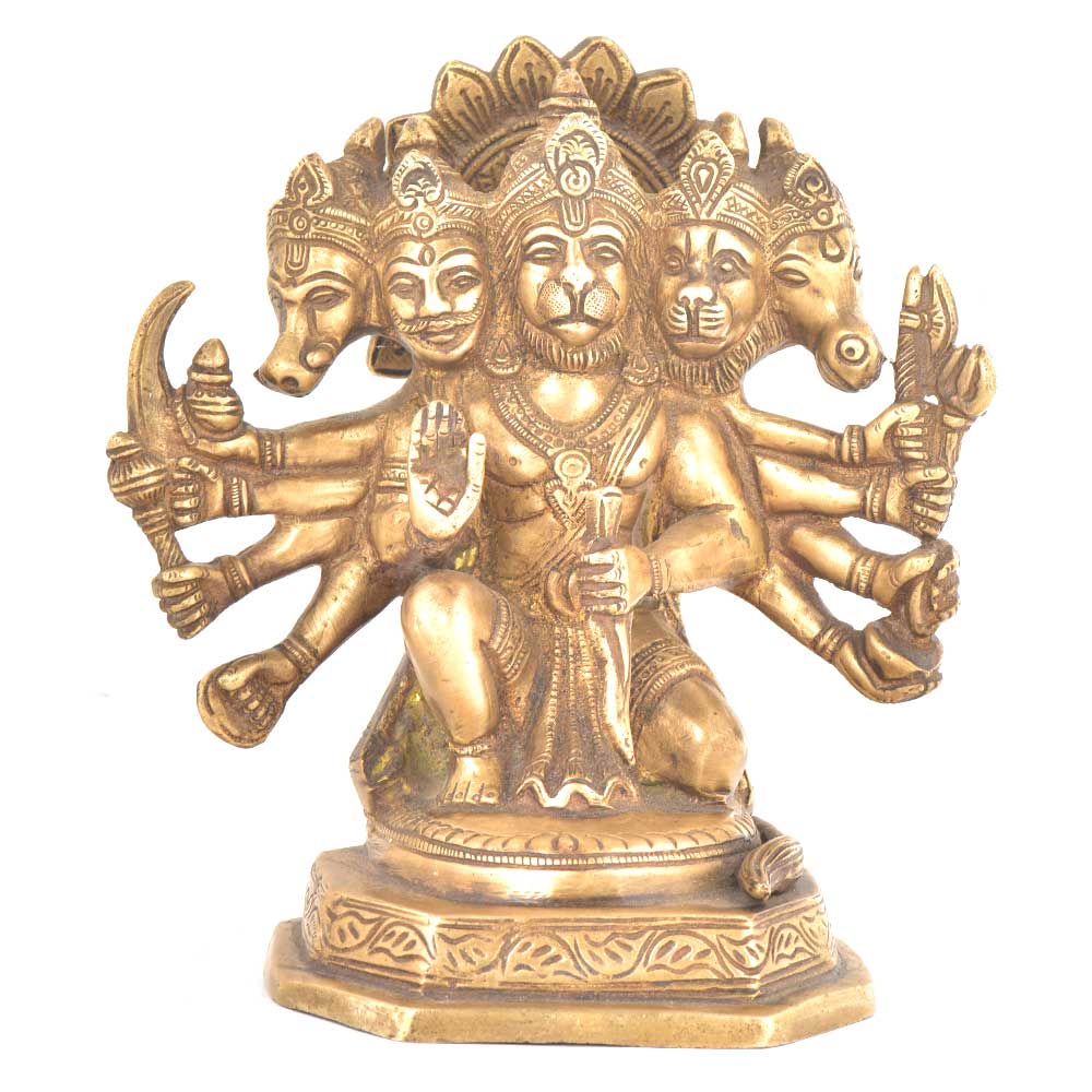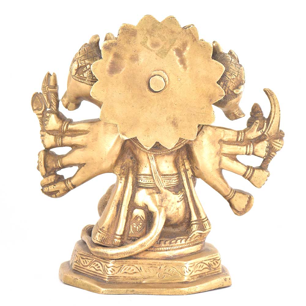 The brass statue shows lord Hanuman in panchmukhi form which means five faced. Hayagriva, Narasimha, Garuda and Varaha are the four other faces along with Hanuman's face.