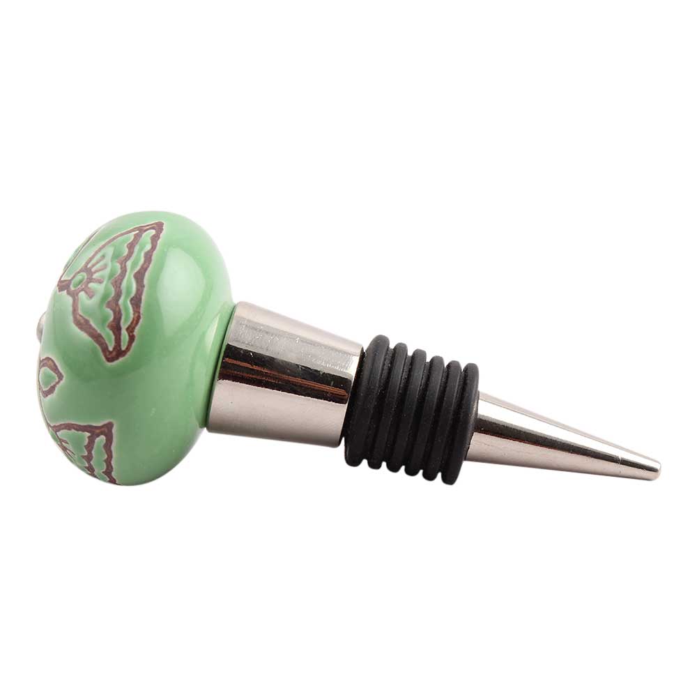 Pea Green Calla Lily Etched Ceramic Wine Stopper. zinc alloy wine bottle stopper with attractive Jute Bag Packaging.