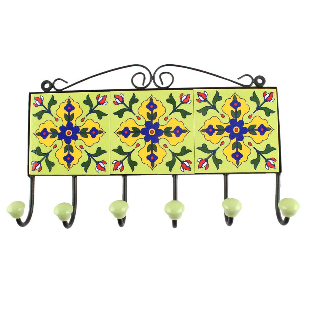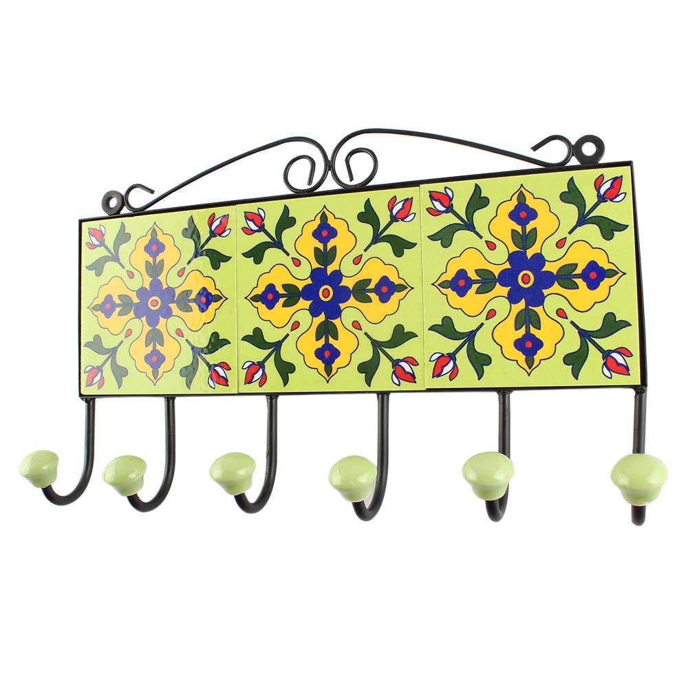 Pea Green Ceramic Floral Tile Hook. When Put on Wall or Cabinet It is An Art in Itself. The Metal Part of this Hook is Black Powder Coated.