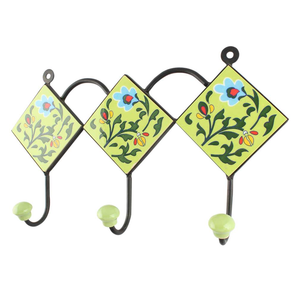 Pea Green Ceramic Floral Tile Hook. When Put on Wall or Cabinet It is An Art in Itself. The Metal Part of this Hook is Black Powder Coated.