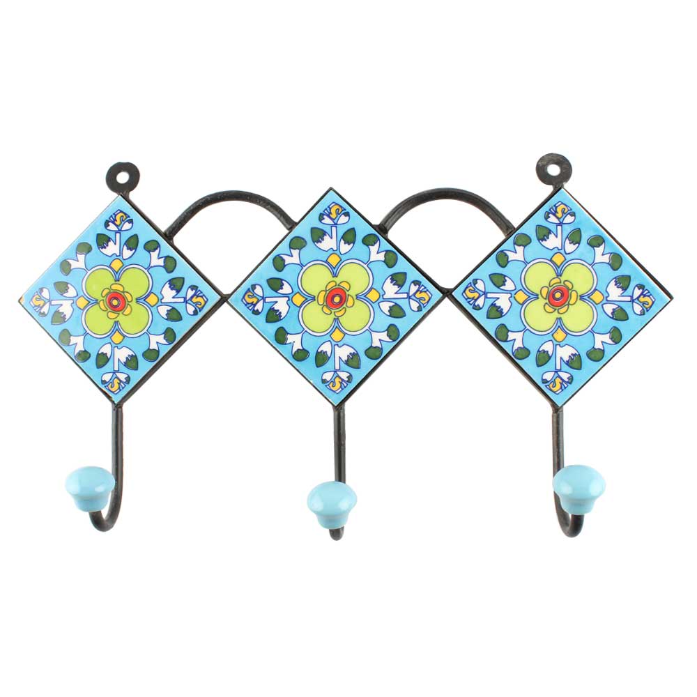 Pea Green Ceramic Floral Tiles Hook. When Put on Wall or Cabinet It is An Art in Itself. The Metal Part of this Hook is Black Powder Coated.