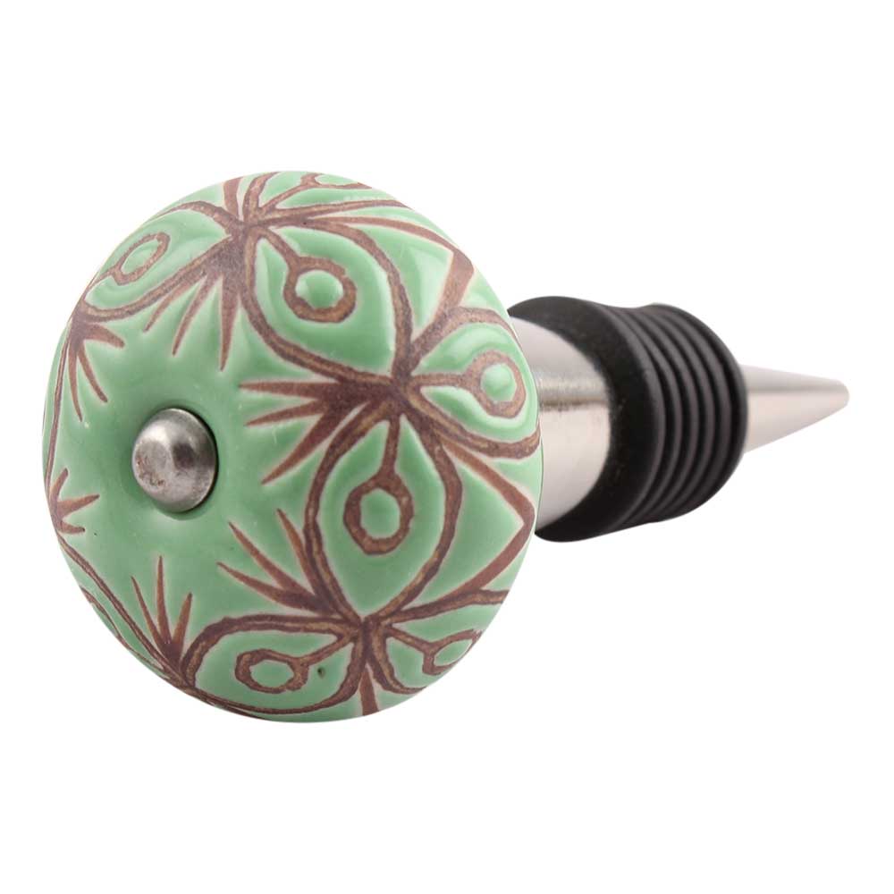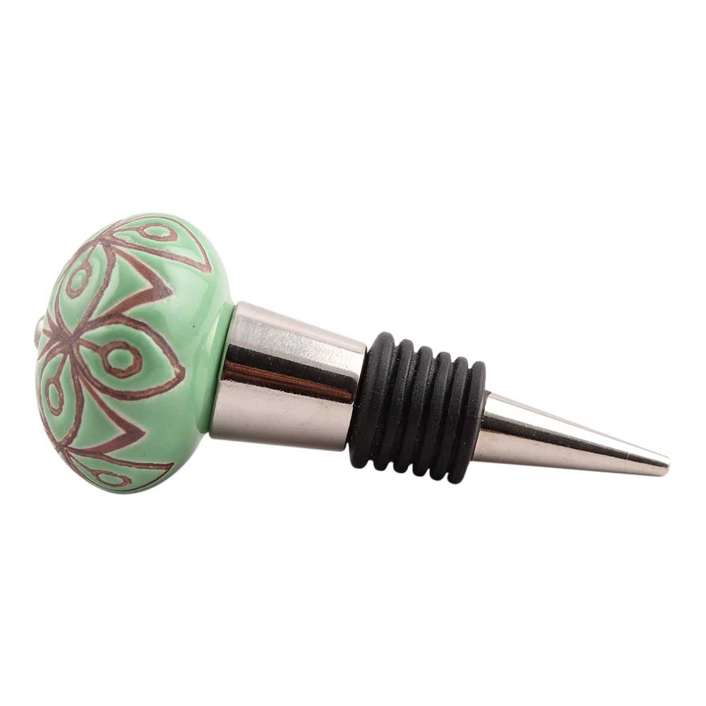 Pea Green Etched Ceramic Wine Stopper.zinc alloy wine bottle stopper with attractive Jute Bag Packaging.