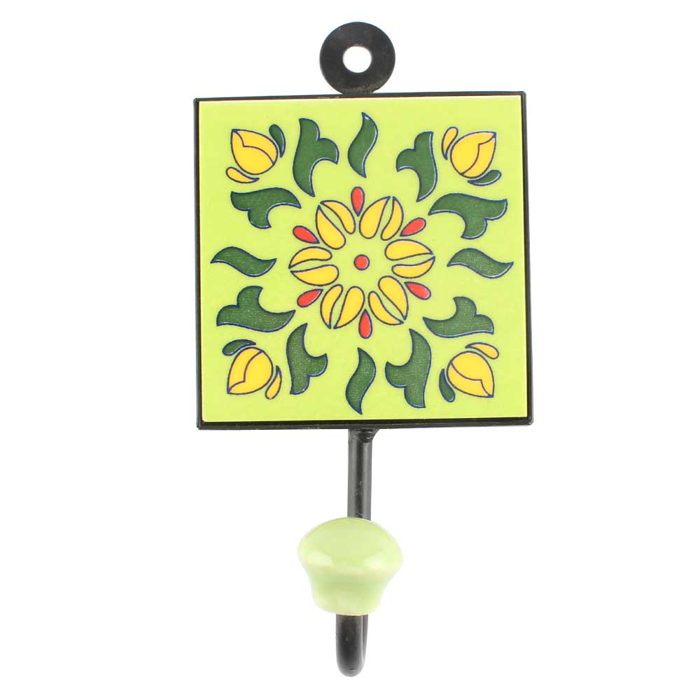 Pea Green Floral Ceramic Tile Wall Hook. When Put on Wall or Cabinet It is An Art in Itself. The Metal Part of this Hook is Black Powder Coated.