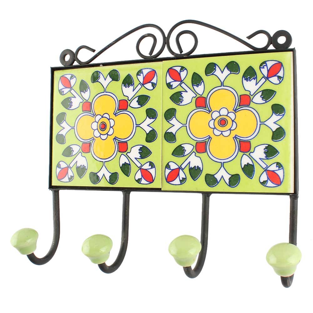 Pea Green Floral Ceramic Tile Wall Hook. When Put on Wall or Cabinet It is An Art in Itself. The Metal Part of this Hook is Black Powder Coated.