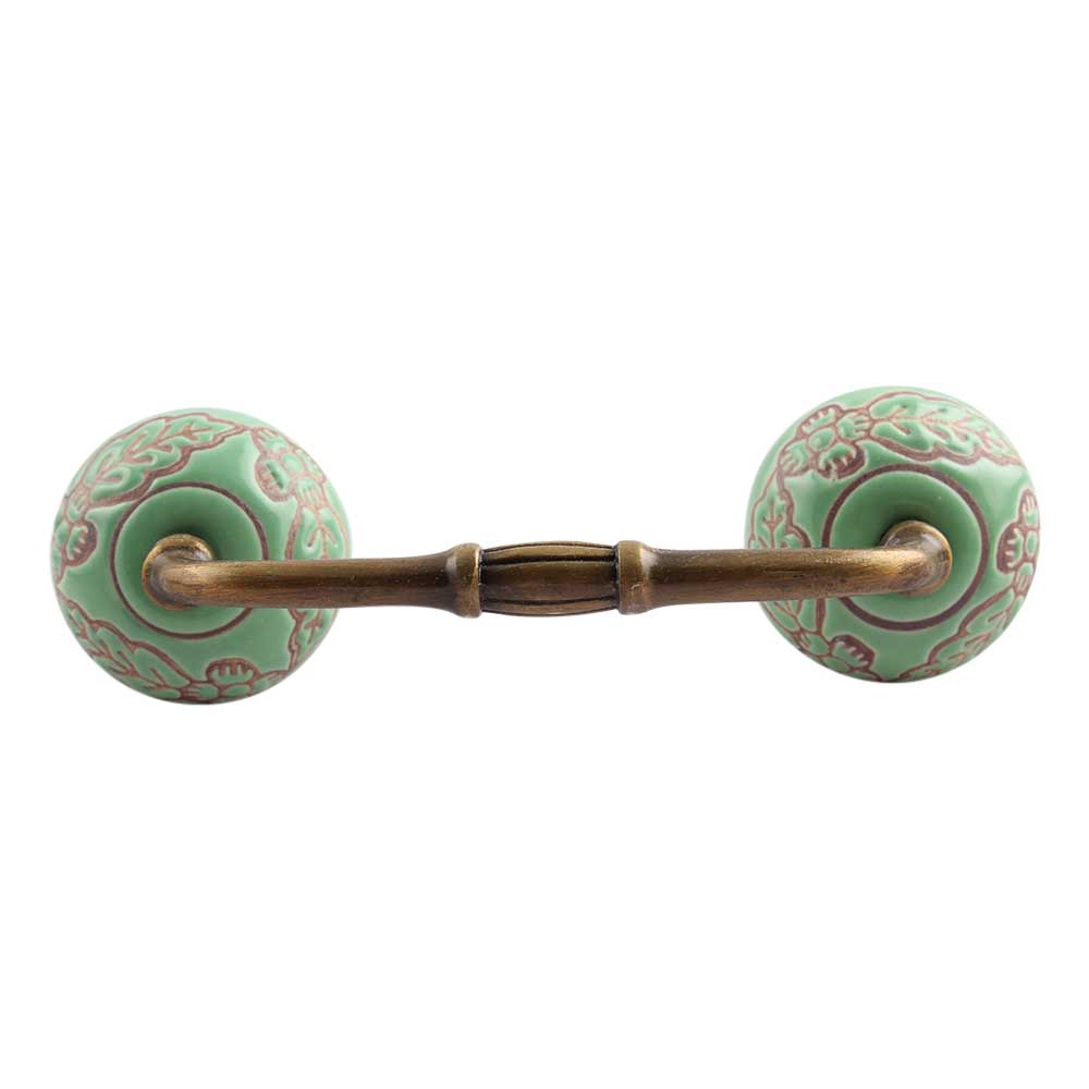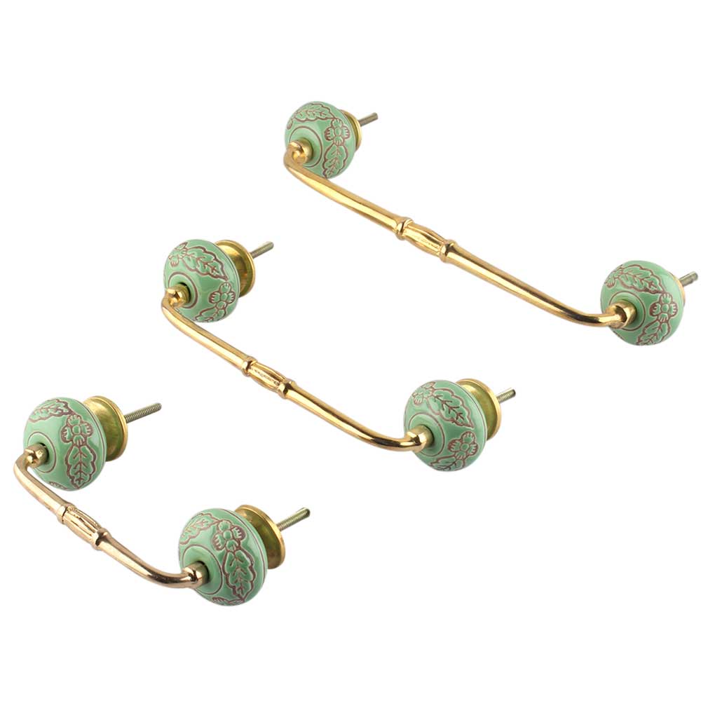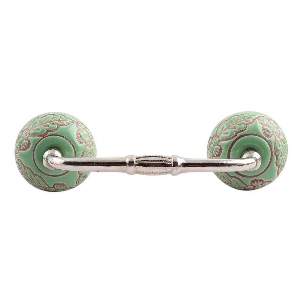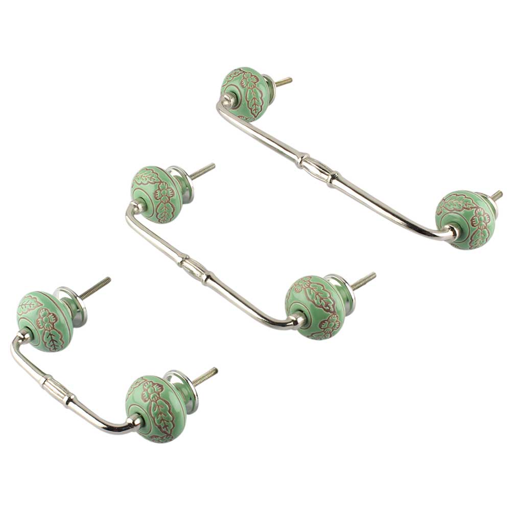 Pea Green Leaf Flower Etched Ceramic Bridge Handle. Ideal for Drawer, Dresser, Cabinet, Wardrobe, Cupboard and Almirah.