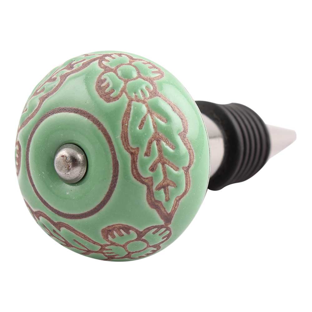 Pea Green Leaf Flower Etched Ceramic Wine Stopper.zinc alloy wine bottle stopper with attractive Jute Bag Packaging.