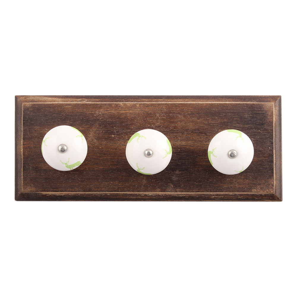 Pea Green Standing Rein Deer Pattern Ceramic Wooden Hook. A Perfect Complement to the Soft Tone of the Wood are these White Traditional Hat & Coat Hook Made of Genuine Porcelain and Brass. It can be use to Hang Jewellery, Leashes, Towels, Scarves, Light Weight Sweaters, Caps Etc.