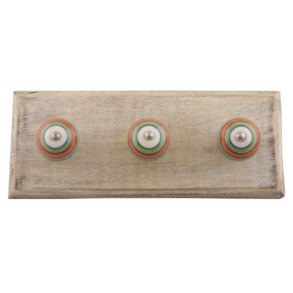 Pea Green Striped Ceramic Wooden Hooks. A Perfect Complement to the Soft Tone of the Wood are these White Traditional Hat and Coat Hook Made of Genuine Porcelain and Brass. It can be used to Hang Jewelry, Leashes, Towels, Scarves, Light Weight Sweaters, Caps etc.