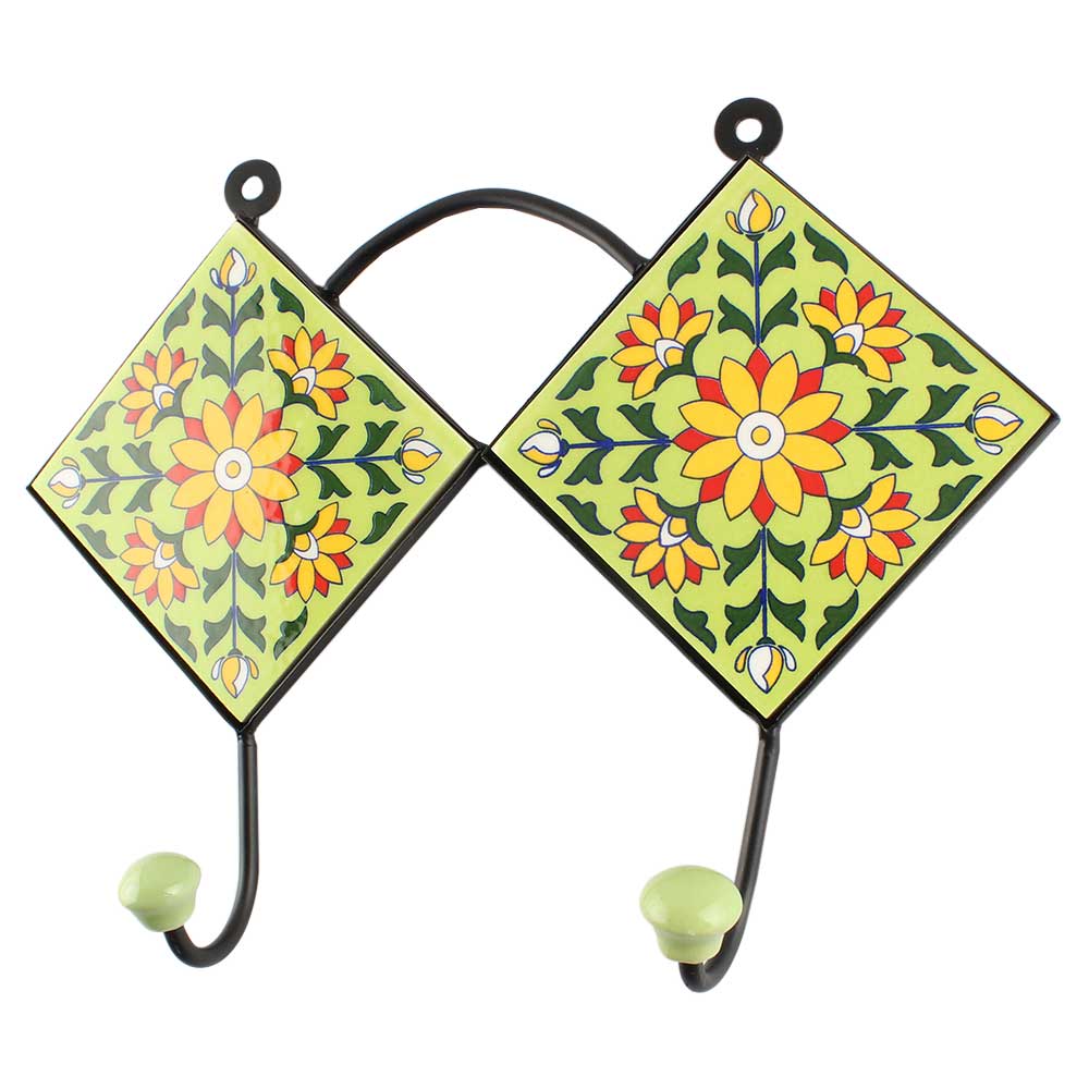 Pea Green Sunflower Ceramic Tile Hook. When Put on Wall or Cabinet It is An Art in Itself. The Metal Part of this Hook is Black Powder Coated.