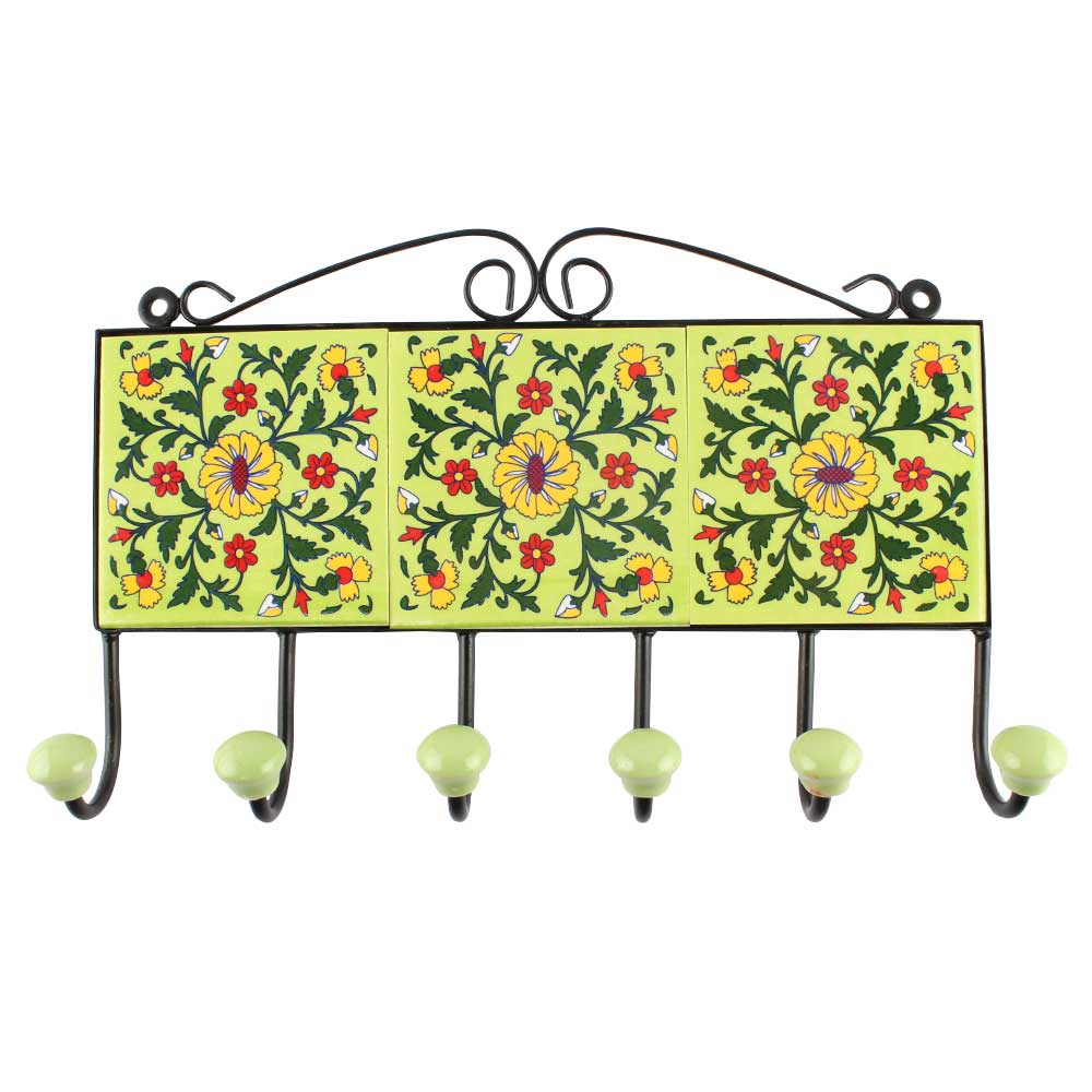 Pea Green Wheel Ceramic Floral Tile Hook Online. When Put on Wall or Cabinet It is An Art in Itself. The Metal Part of this Hook is Black Powder Coated.