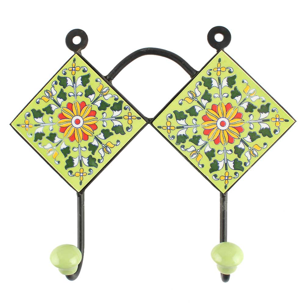 Pea Green Wheel Flower Ceramic Tile Hook. When Put on Wall or Cabinet It is An Art in Itself. The Metal Part of this Hook is Black Powder Coated.