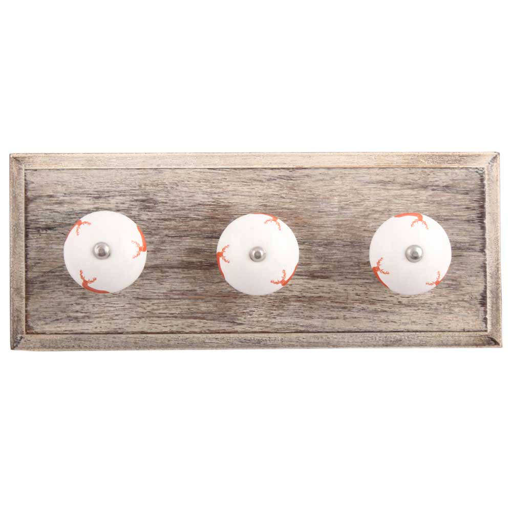 Peach Standing Rein Deer Pattern Ceramic Wooden Hook. A Perfect Complement to the Soft Tone of the Wood are these White Traditional Hat & Coat Hook Made of Genuine Porcelain and Brass. It can be use to Hang Jewellery, Leashes, Towels, Scarves, Light Weight Sweaters, Caps Etc.