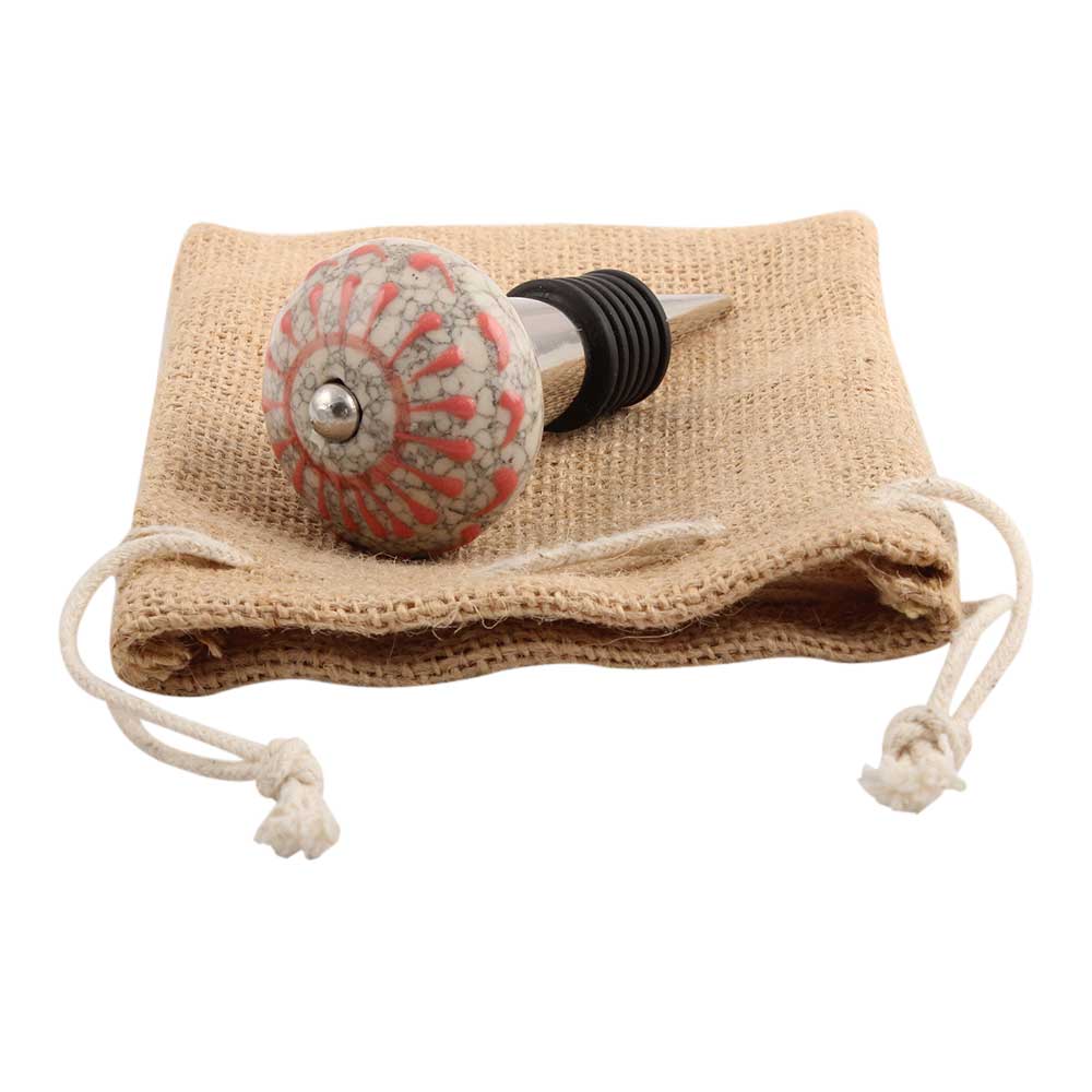 Peach Wheel Crackle Ceramic Wine Stopper.Zinc Alloy Wine Bottle Stopper with Attractive Jute Bag Packaging.