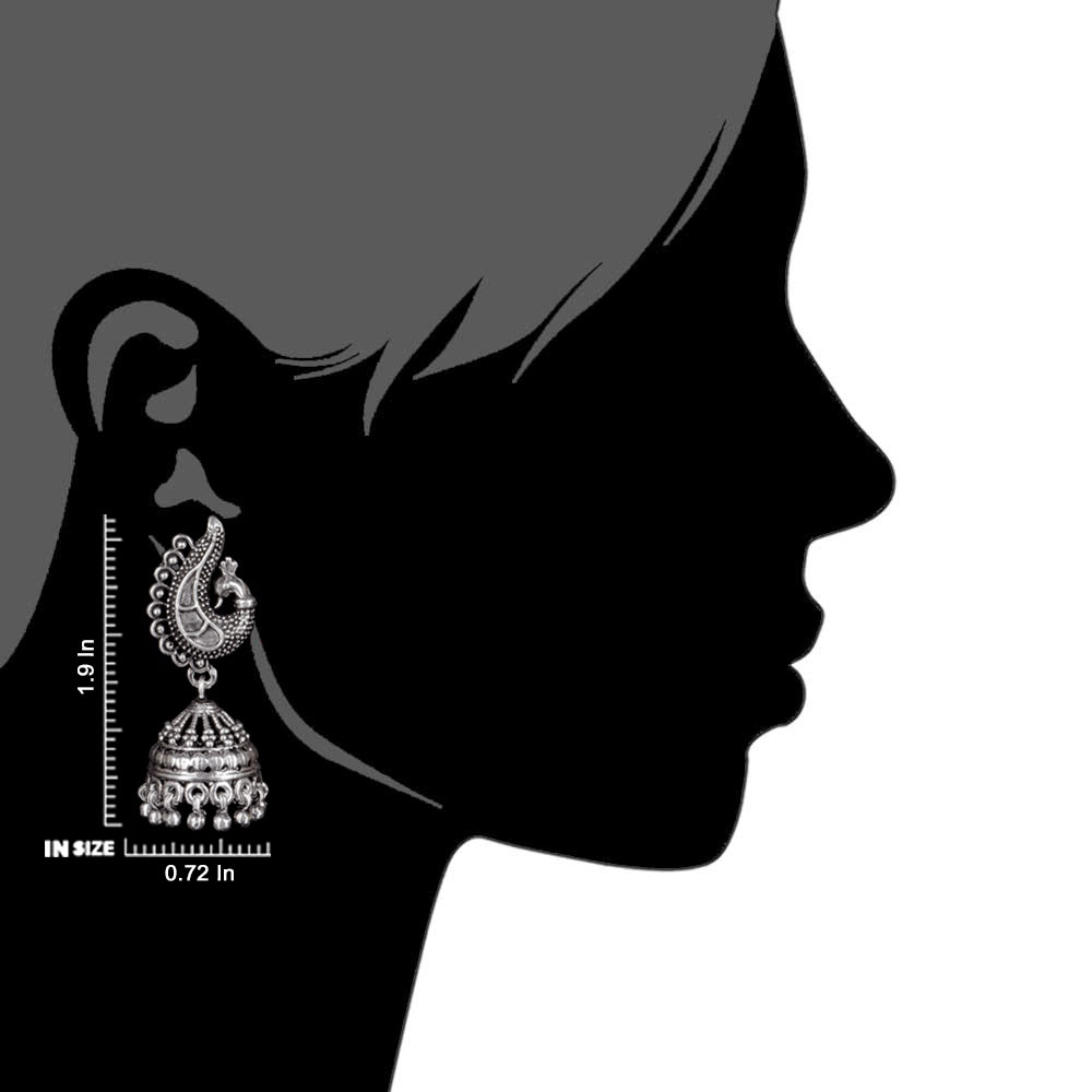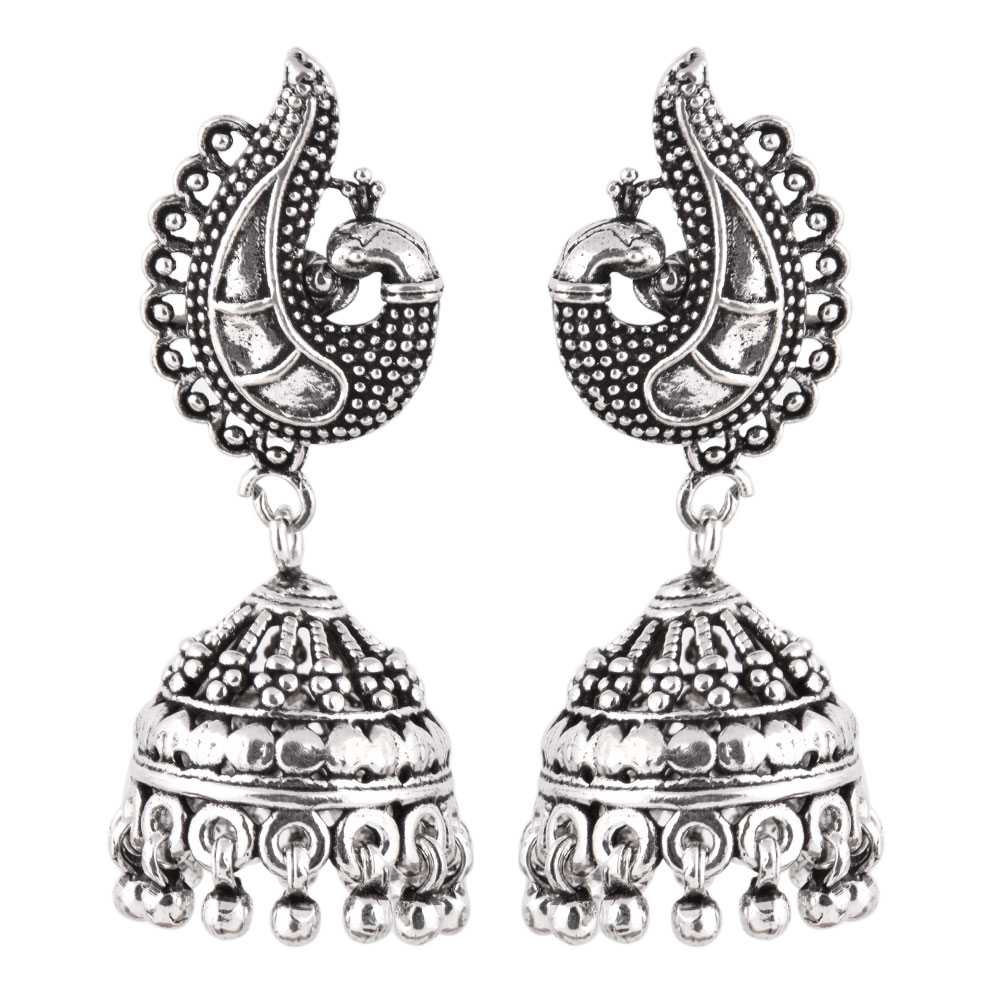 These 925 Sterling silver jhumkis can be worn at all auspicious function wedding, engagements or during the festival time. It can also be worn on regular basis. It has a lovely peacock motif top and embellished with metallic beads. An ideal present for your mother, sister or wife.
